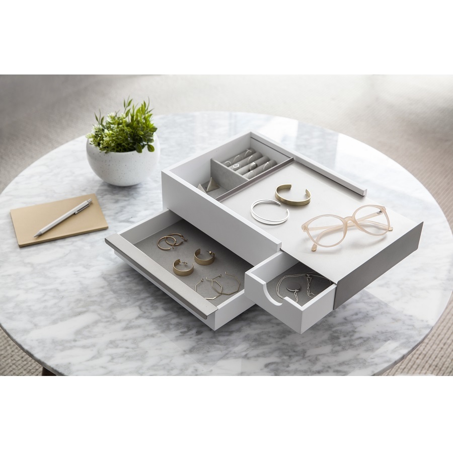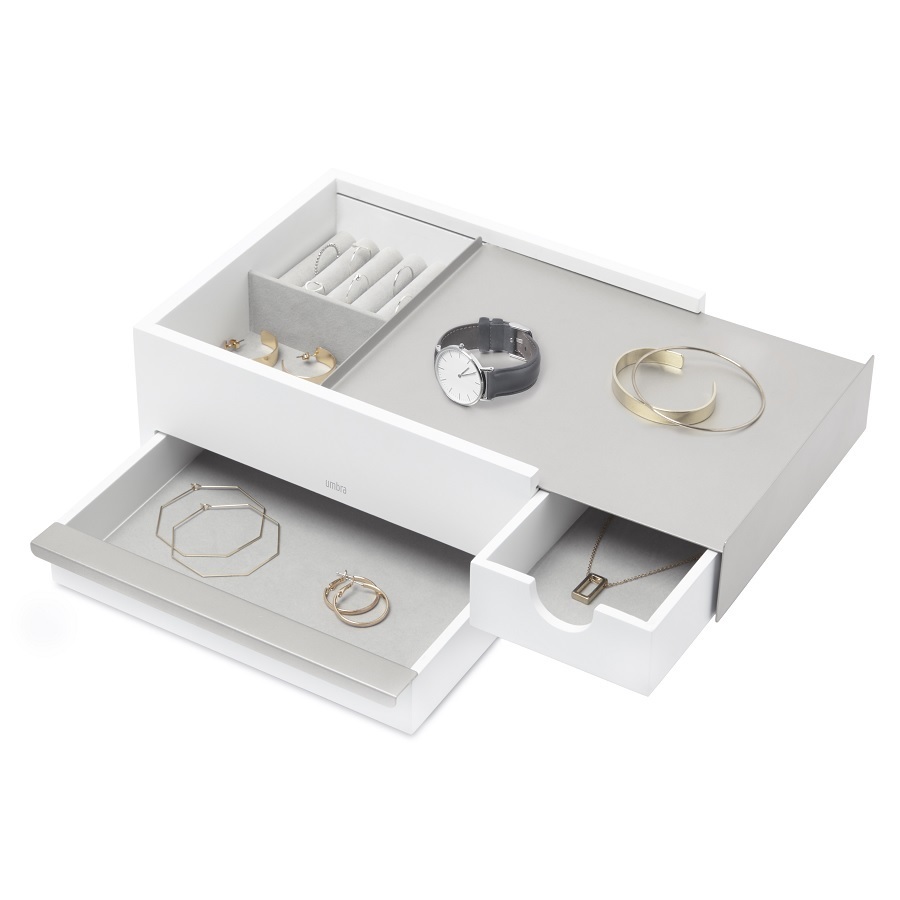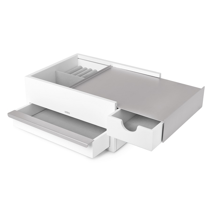 Большая деревянная шкатулка для украшений Stowit с несколькими отделениям. Верхний отсек оснащен кармашками для колец или запонок и небольшими ящичками для прочих мелочей. Нижняя часть предназначена для хранения более крупных украшений: часов или браслетов. Сочетание натурального дерева и белого металла делает шкатулку отличным подарком для ценителей изящных аксессуаров. Дизайн: Sung wook Park