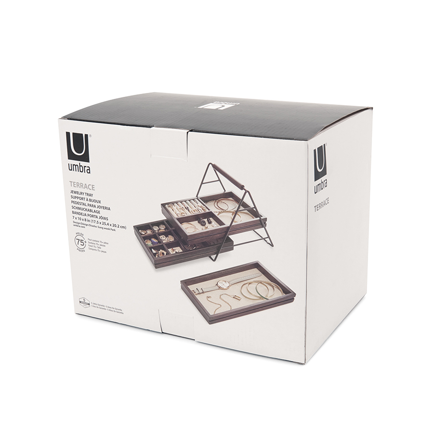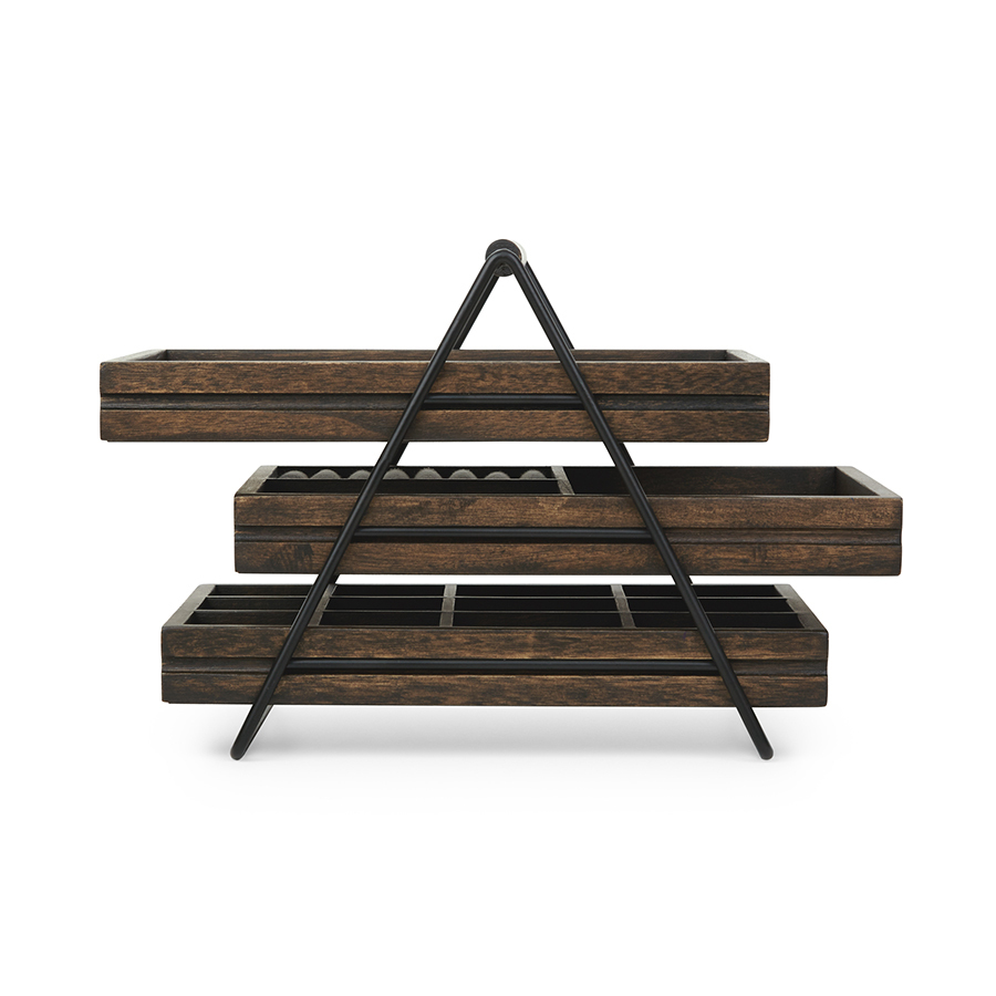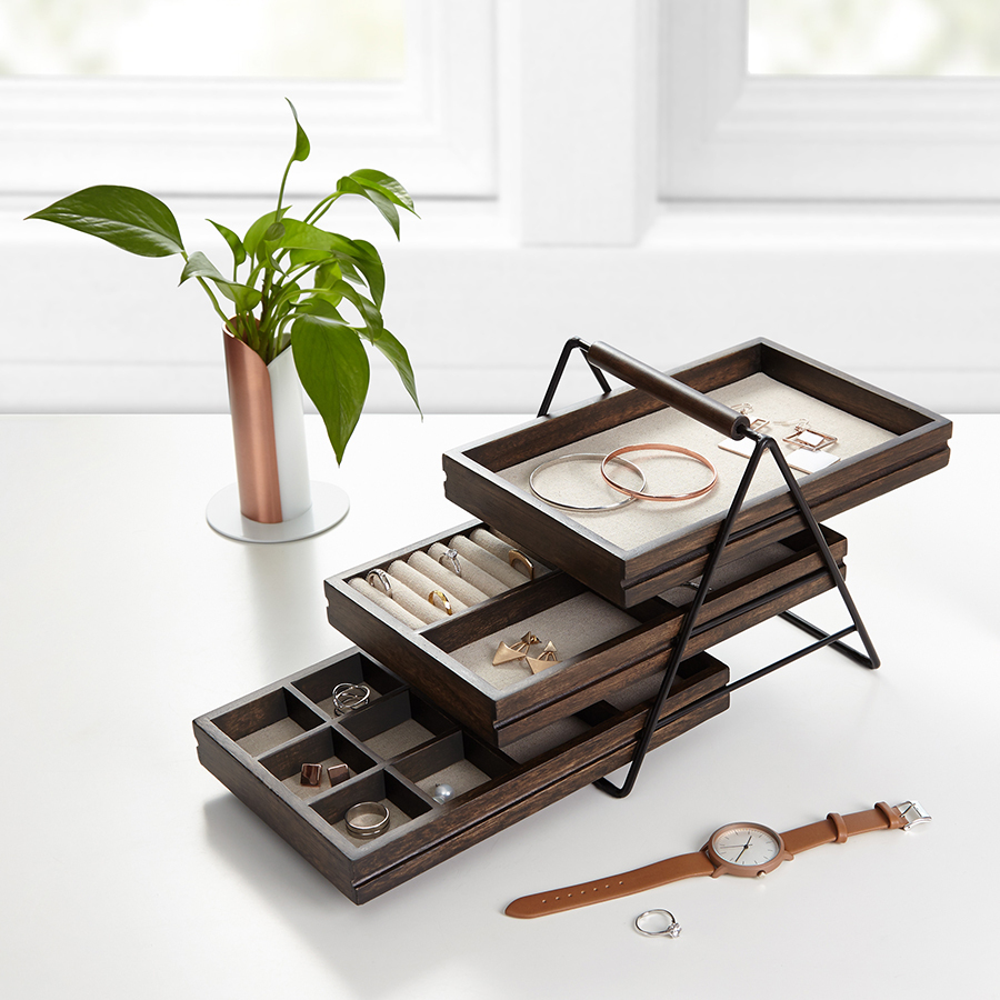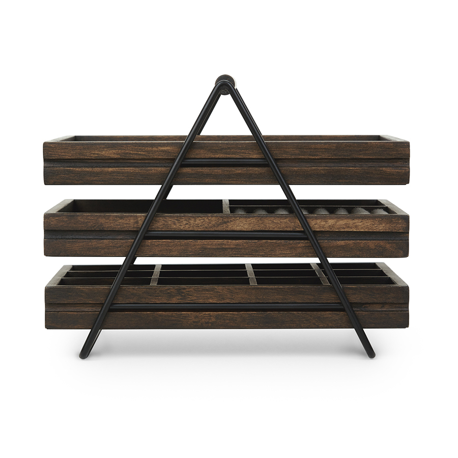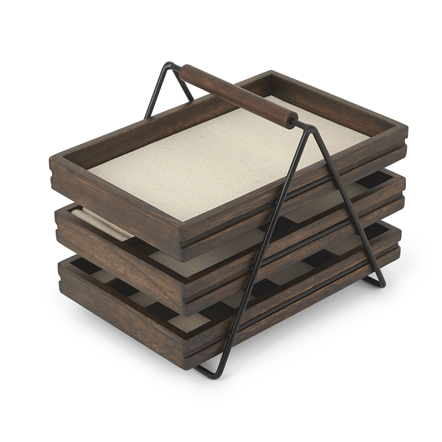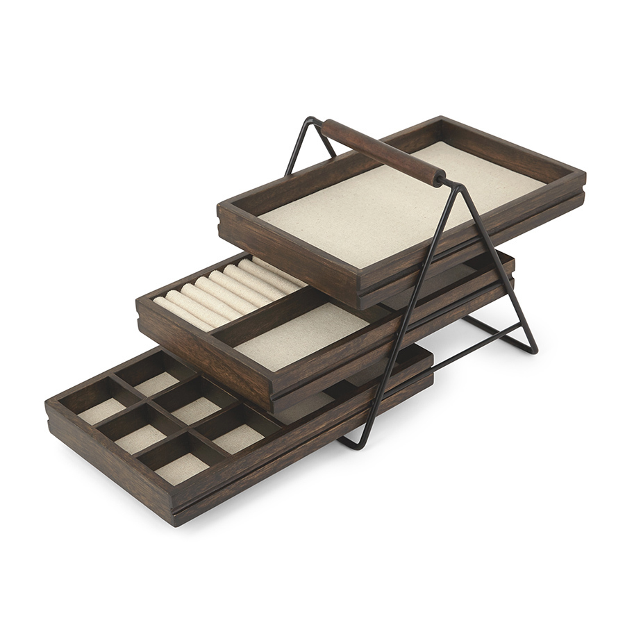 Деревянная многоярусная шкатулка для украшений. Три отделения раздвигаются друг относительно друга, благодаря чему всё содержимое шкатулки будет перед глазами. Внутренняя часть отделана льном. В шкатулке есть подушечки для хранения колец или запонок, маленькие секции для серёжек и брошей и большое отделение для браслетов, цепочек и ожерелий. Дизайнер Sung Wook Park