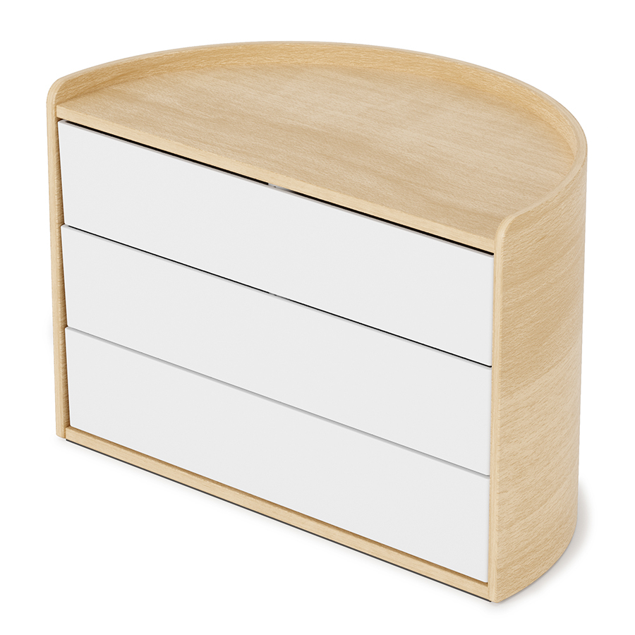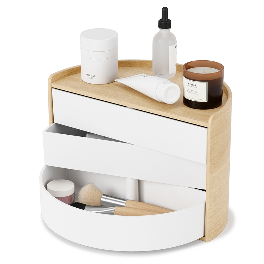 На верхнюю полку шкатулки можно ставить духи, держатели для колец или небольшие декоративные растения. Три вместительных ящика вращаются, обеспечивая легкий доступ к украшениям.