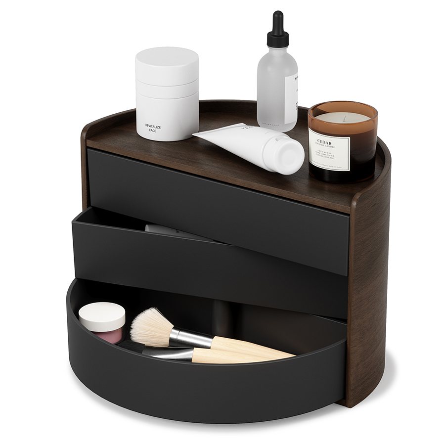 На верхнюю полку шкатулки можно ставить духи, держатели для колец или небольшие декоративные растения. Три вместительных ящика вращаются, обеспечивая легкий доступ к украшениям.
