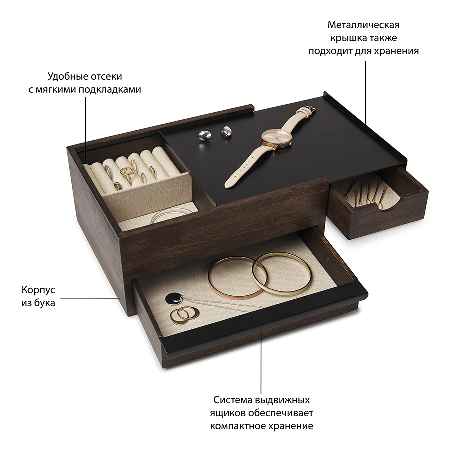 Верхнее отделение оснащено кармашками для колец или запонок и небольшими ящичками для прочих мелочей. Нижняя часть предназначена для хранения более крупных аксессуаров: часов или браслетов.