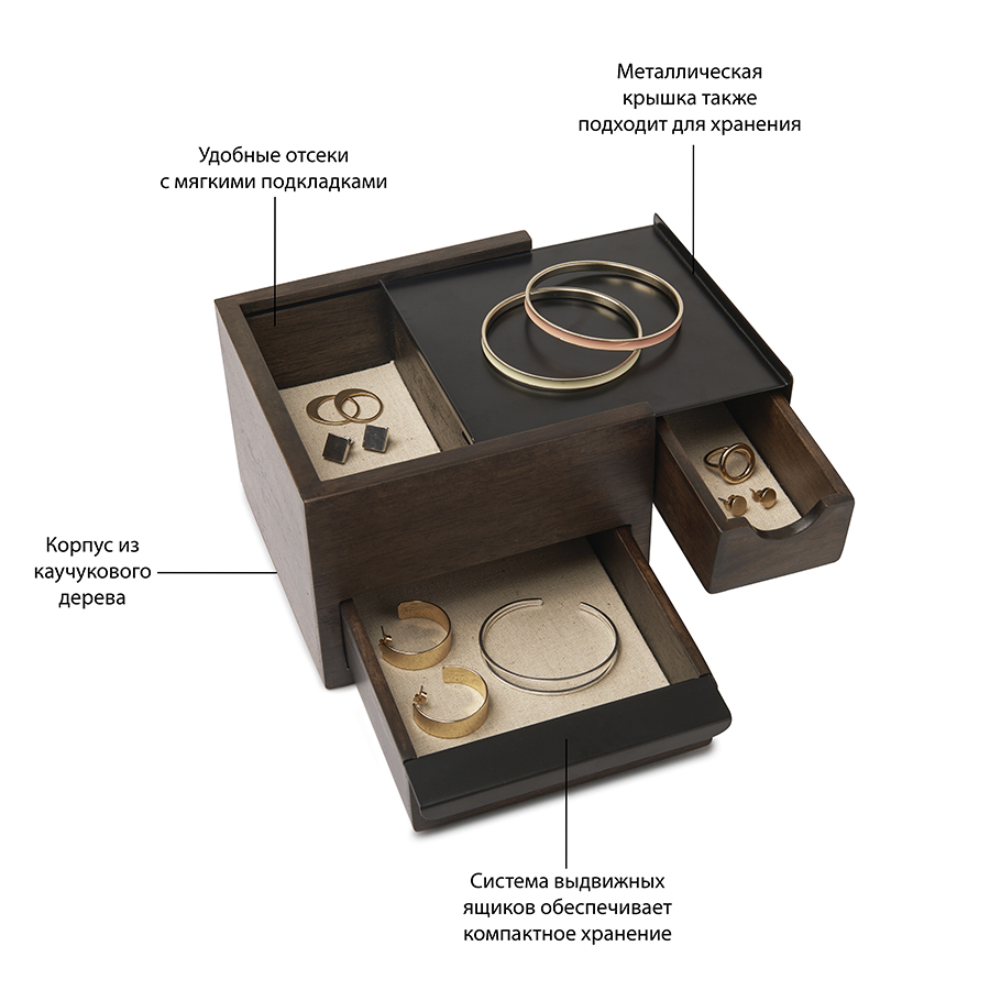Два больших отделения для хранения крупных предметов — колец, браслетов, часов, и один небольшой "потайной" ящичек для запонок, сережек или цепочек.