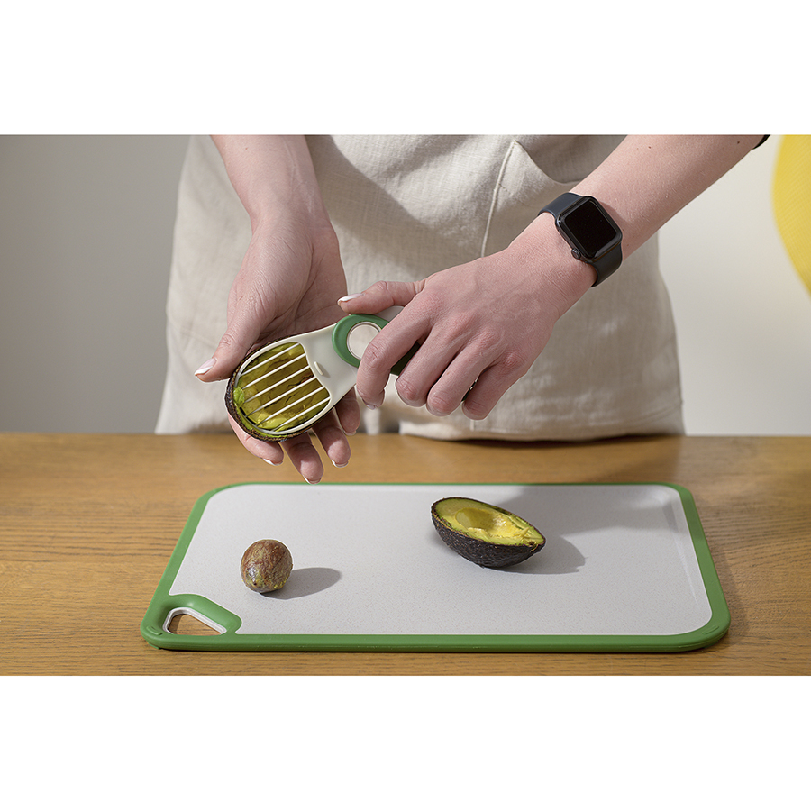 Слайсер для авокадо Vik 5 в 1 поможет одним движением руки удалить косточку, разделить мякоть на ровные кусочки и при необходимости превратить ее в однородную кашицу. Специальная зазубренная кромка легко прорезает кожицу, а изогнутый наконечник быстро извлекает целые половинки плода. Изделие выполнено из полипропилена. Материал хорошо очищается от загрязнений, устойчив к износу. Благодаря складной конструкции инструмент занимает минимум места при хранении, без труда помещается в ящик кухонного стола и органайзер.