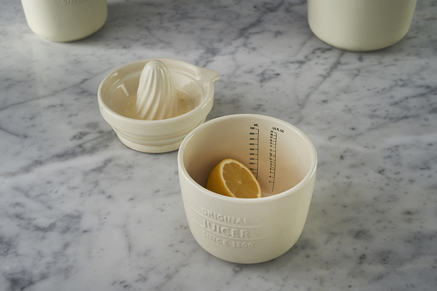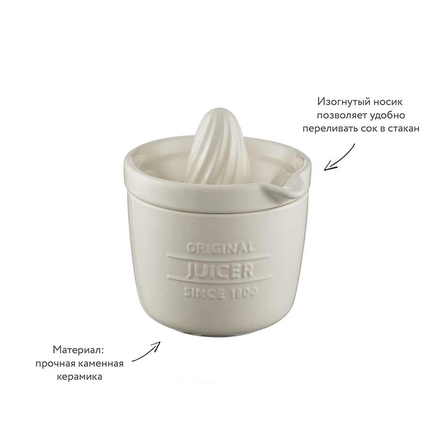 Свежевыжатый сок собирается в контейнер, а изогнутый носик позволяет удобно переливать жидкость в стакан объемом 550 мл. Изделие выполнено из каменной керамики, которая не впитывает запахи и сохраняет натуральный вкус напитка.