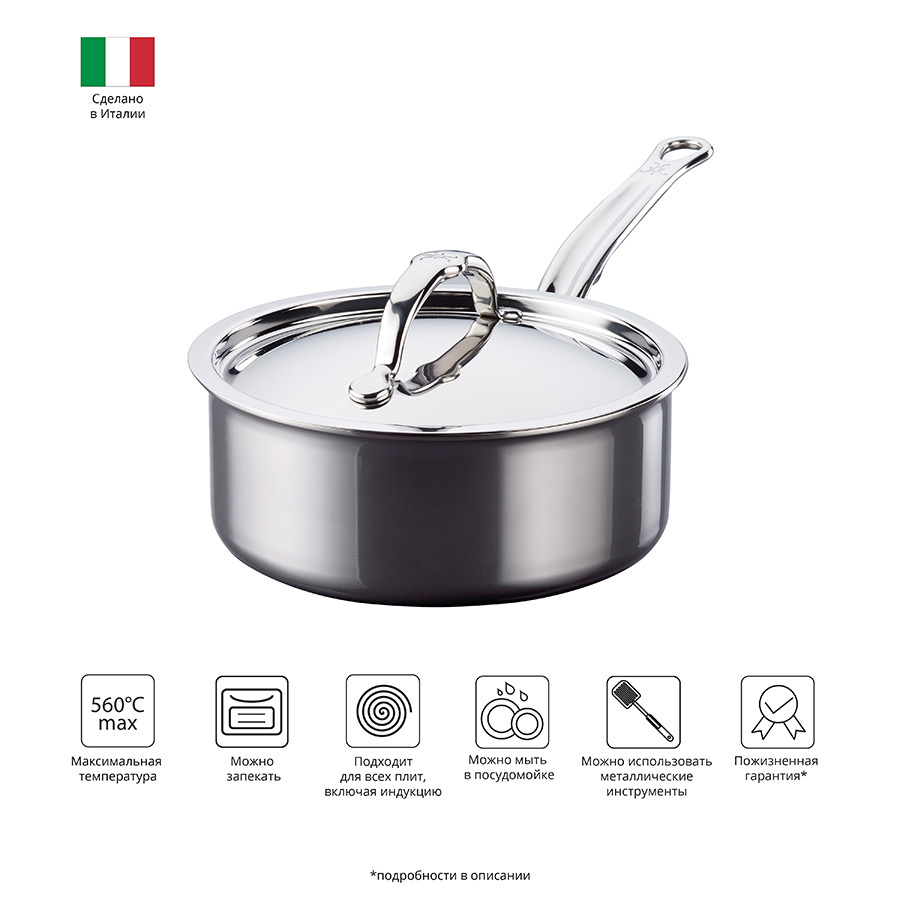 Сотейник c крышкой отлично подойдет для приготовления соусов, горячего шоколада, варки яиц или разогревания небольших порций любимых блюд. Посуда Hestan представлена многослойной конструкцией с внешним и наружным покрытием Nanobond. Это уникальная запатентованная технология, которая создается на основе тысяч сверхплотных нанослоев из стали с молекулами титана. Благодаря этому изделие чрезвычайно прочное и устойчивое к окислению и царапинам. Сотейник снабжен алюминиевым сердечником, который увеличивает на 35% теплопроводность, обеспечивая быстрый нагрев и превосходное удержание тепла. Внешний слой выполнен из стали, подходящей для индукционных плит. Эргономичная ручка украшена гравировкой с логотипом бренда. Посуда отличается высокой термостойкостью, максимальная температура нагрева составляет до 560 °C. Сотейник можно мыть в посудомоечной машине и использовать в духовом шкафу. На посуду Hestan предоставляется пожизненная гарантия.