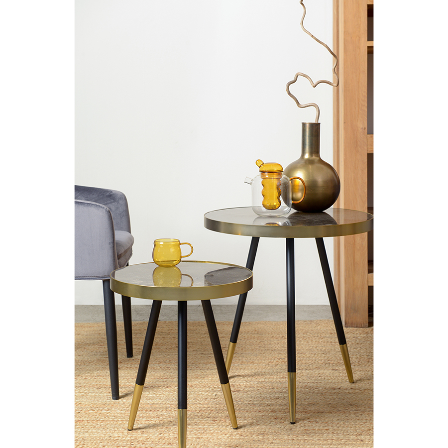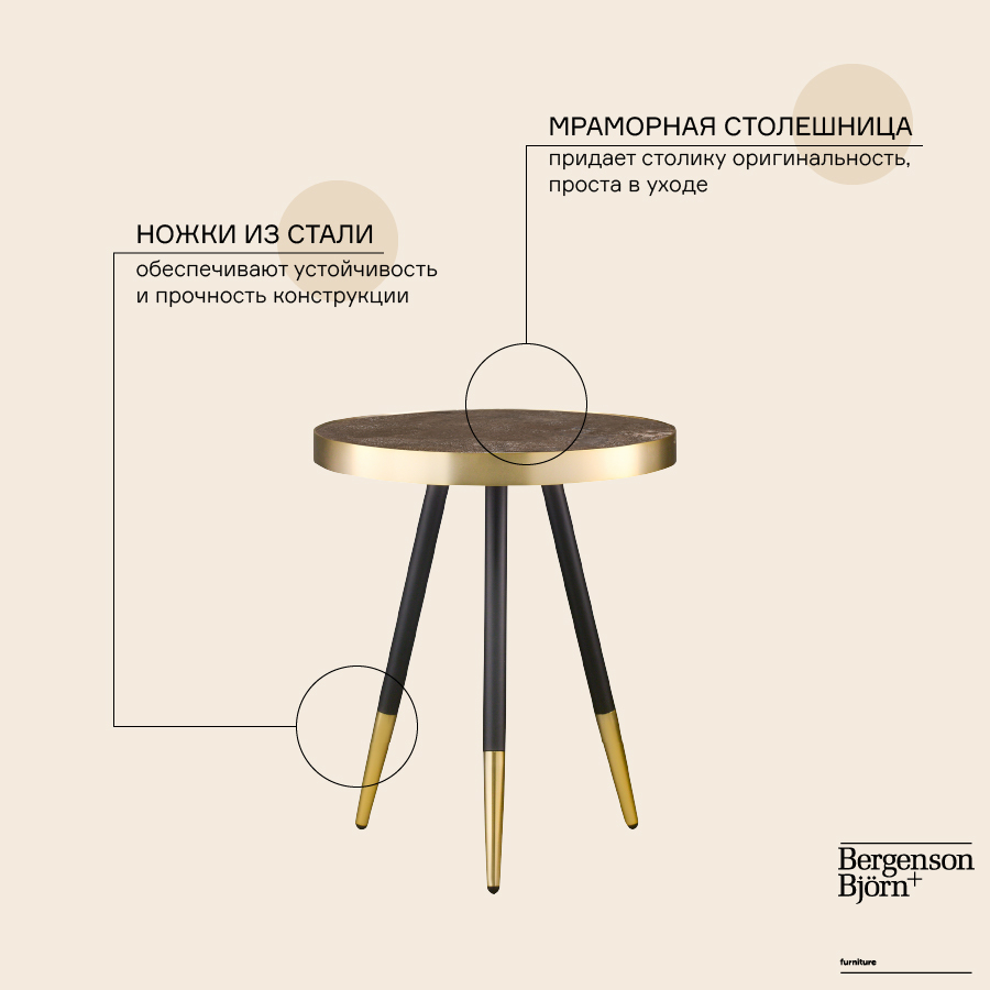 Материалы: столешница – мрамор, каркас – сталь с порошковым покрытием. Размеры: диаметр – 40 см, высота – 48 см.
