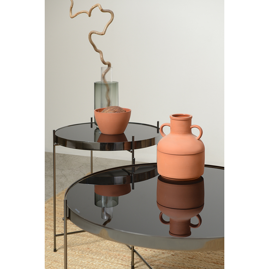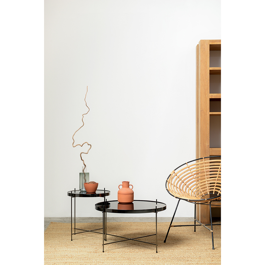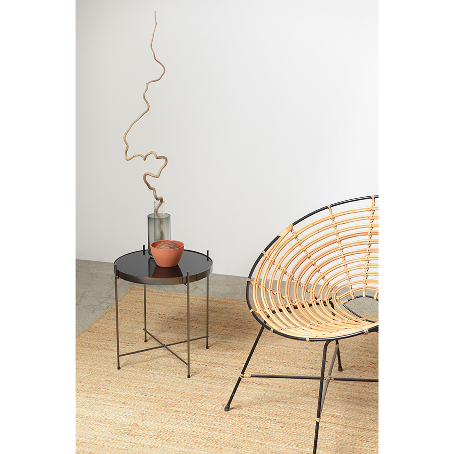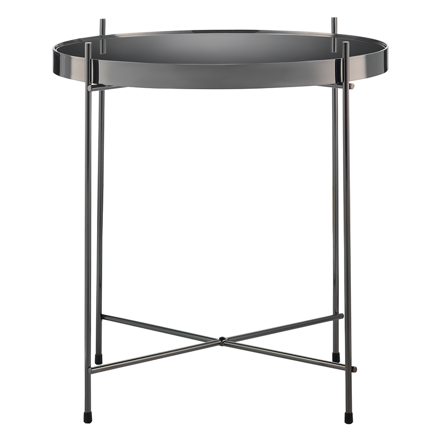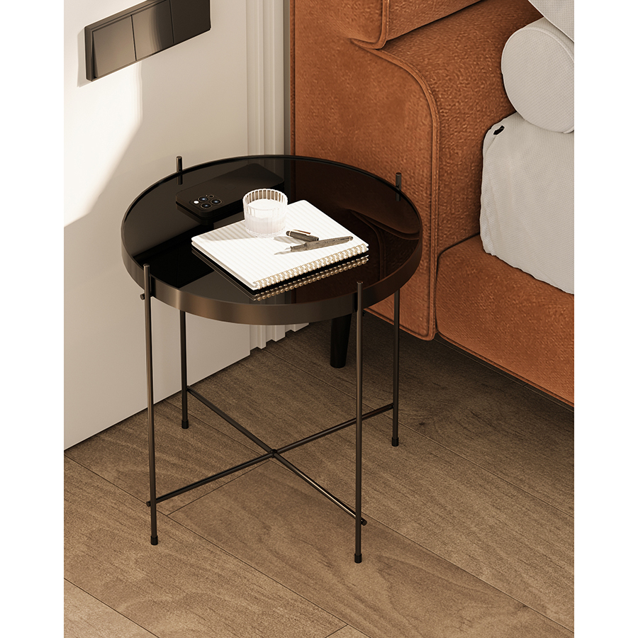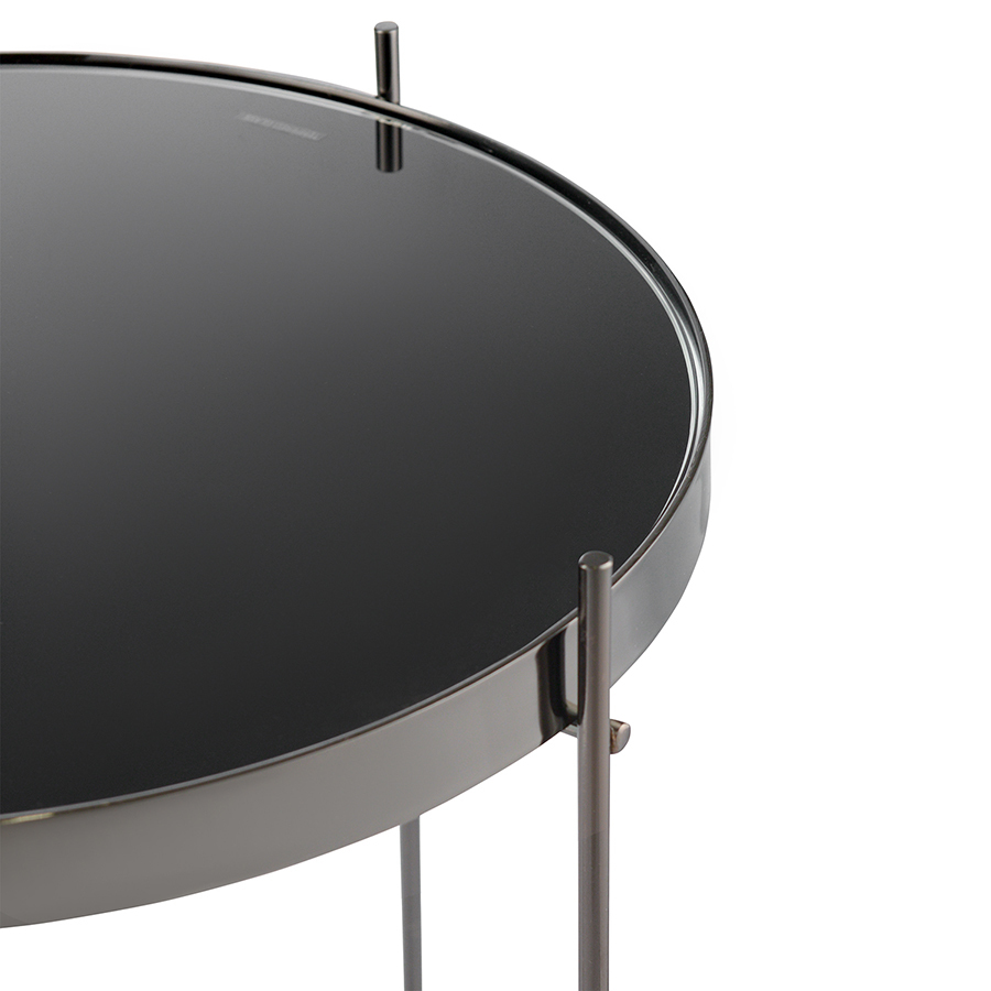 Материалы: столешница – черное закаленное стекло, каркас – сталь. Размеры: диаметр – 42,7 см, высота – 43 см.
