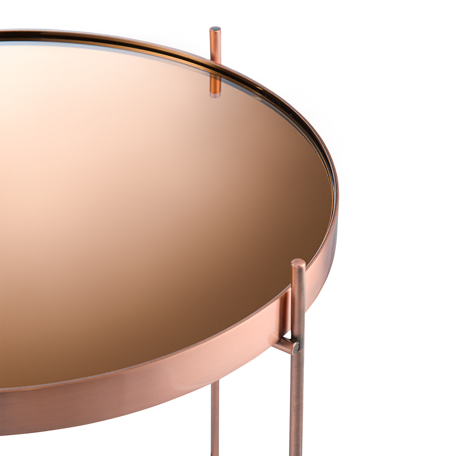 Материалы: столешница – тонированное зеркало медного оттенка, каркас – сталь с медным напылением. Размеры: диаметр – 42,7 см, высота – 45 см.