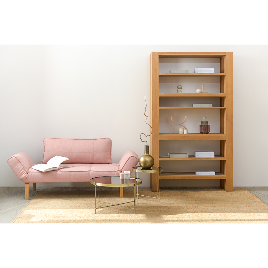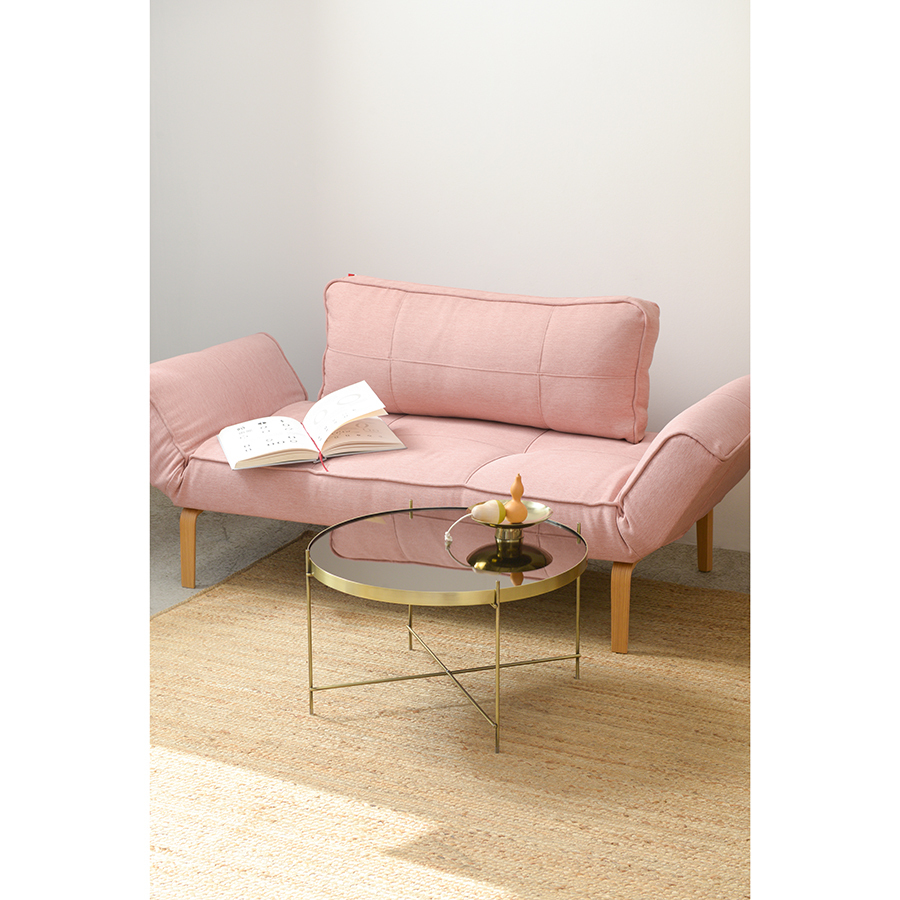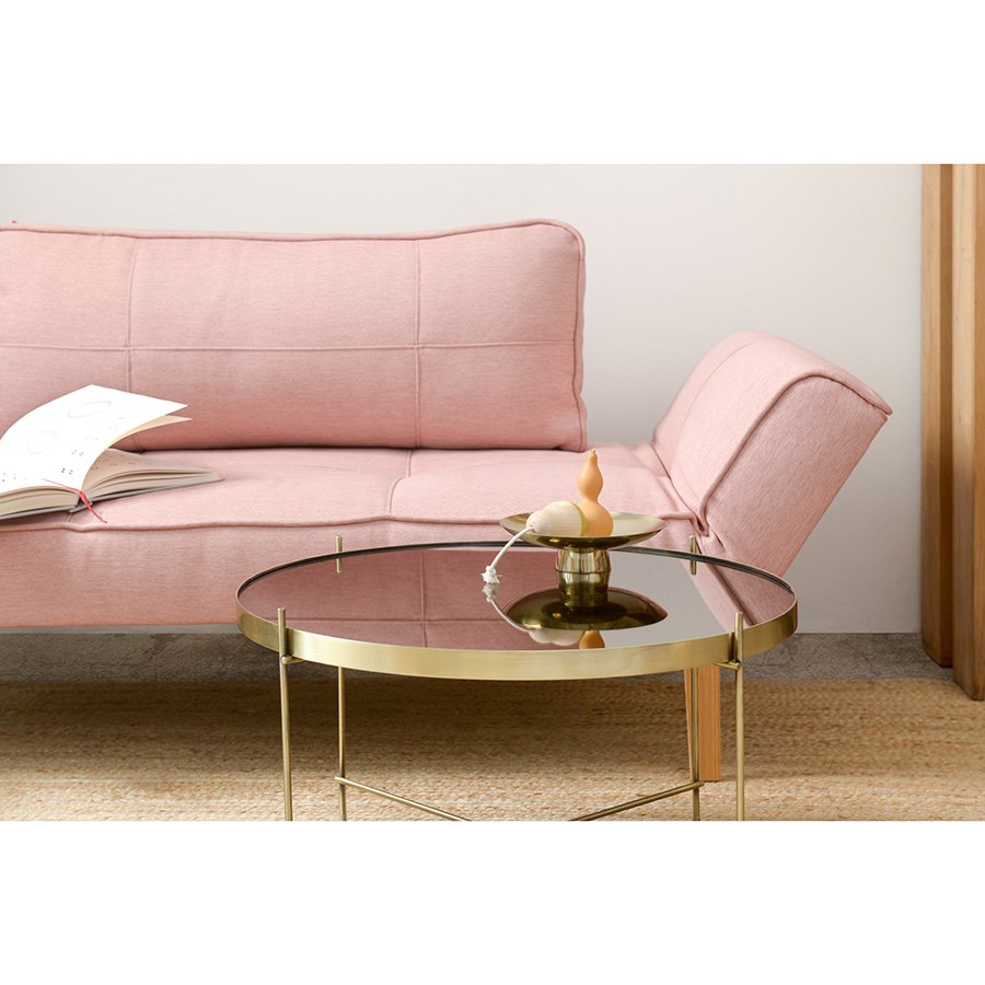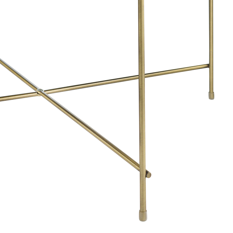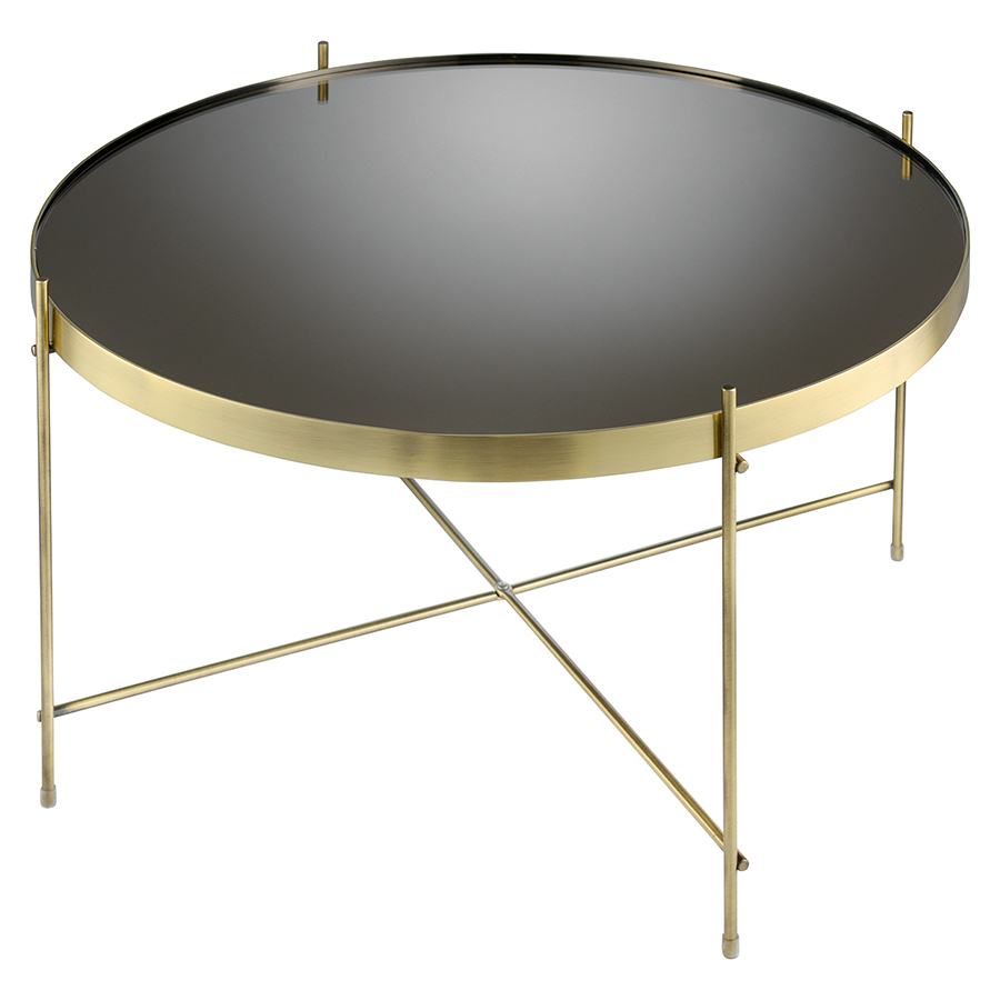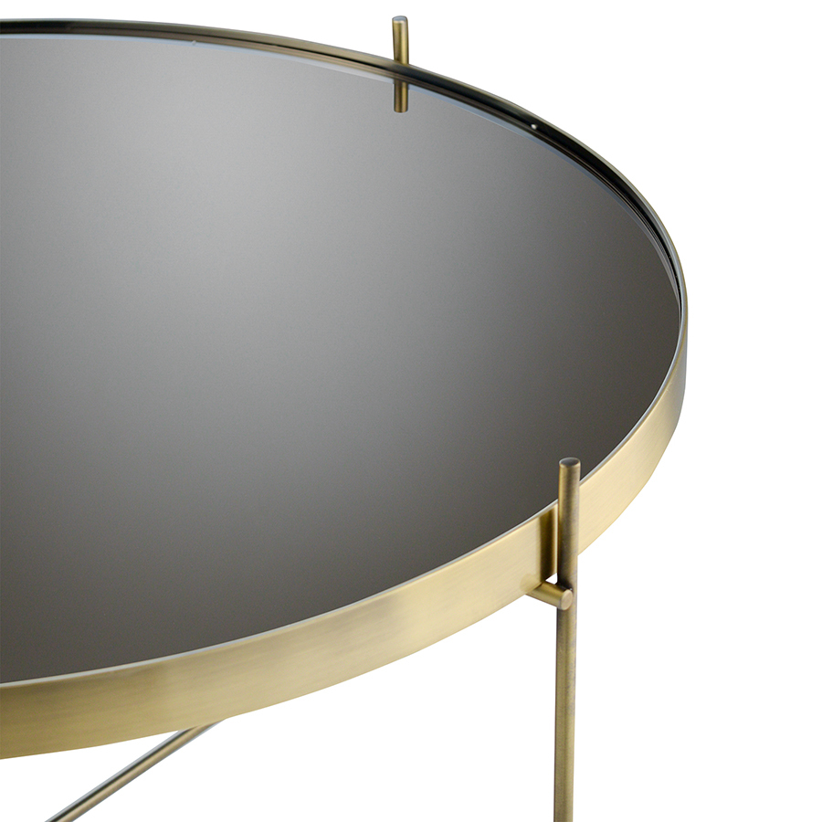Материалы: столешница – коричневое зеркало, каркас – сталь с латунным напылением. Размеры: диаметр – 64,4 см, высота – 38 см.