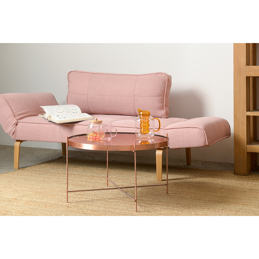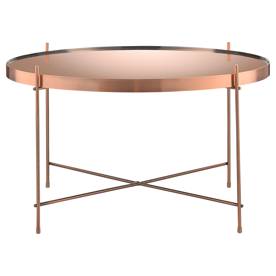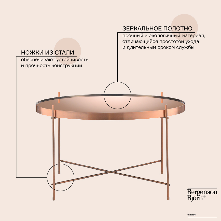 Материалы: столешница – розовое зеркало, каркас – сталь с медным покрытием. Размеры: диаметр – 64,4 см, высота – 38 см.