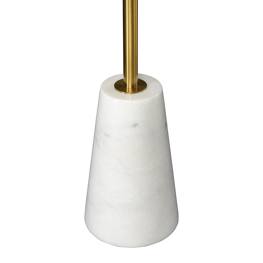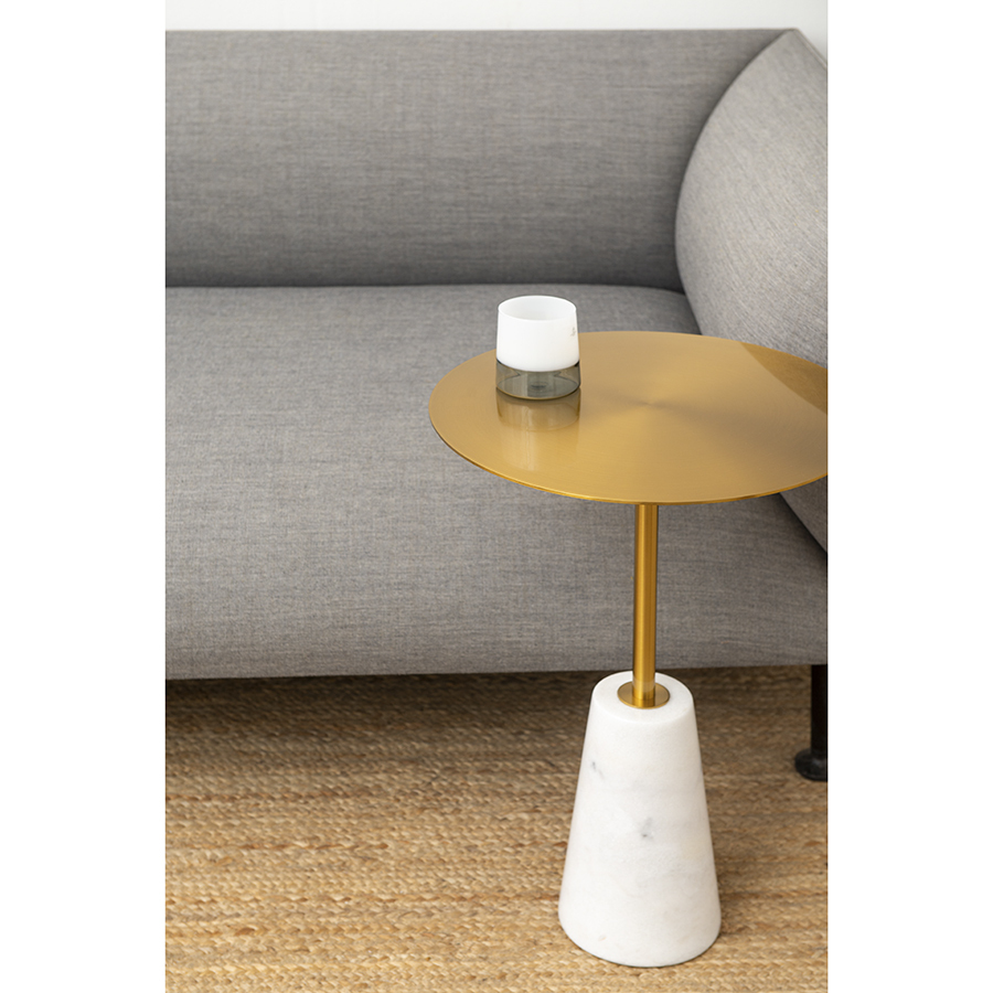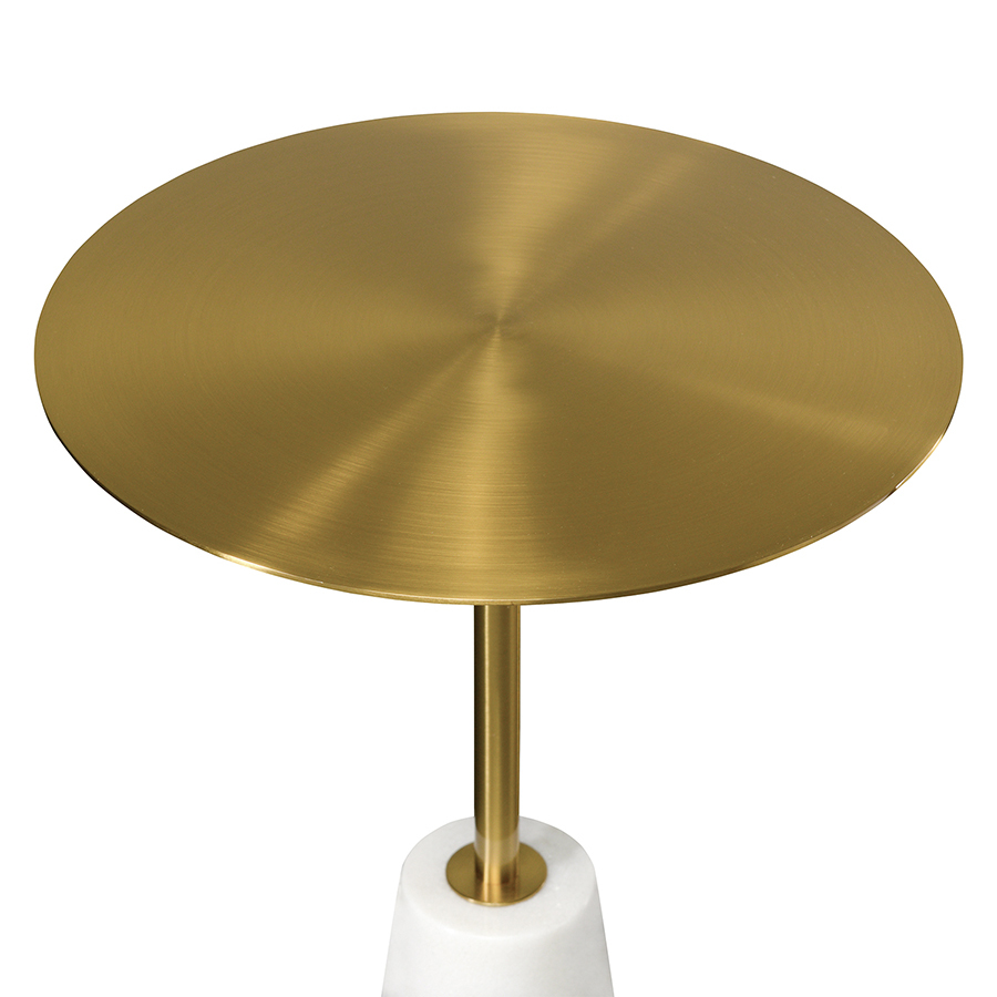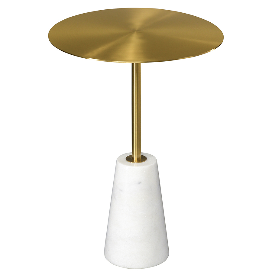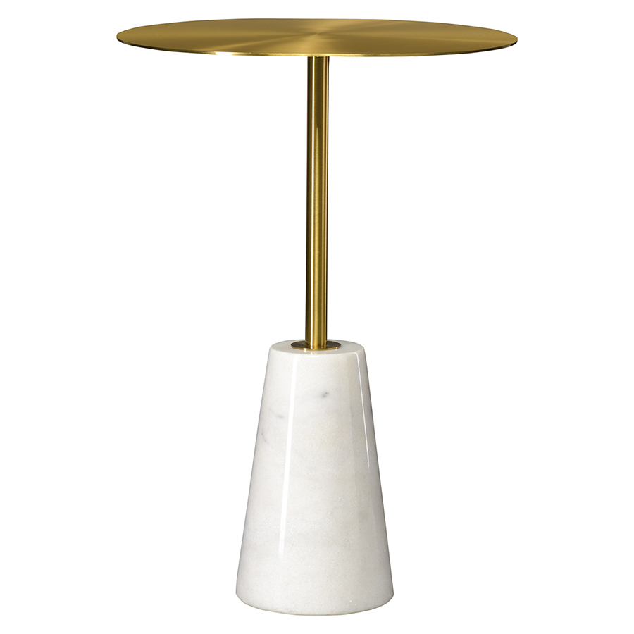 Материалы: столешница и ножка – углеродистая сталь, основание – мрамор. Максимальная нагрузка - 10 кг. Диаметр: 40 см. Высота: 56 см. Цвет: латунь/белый.