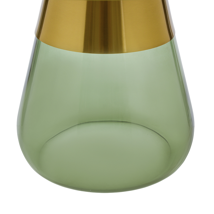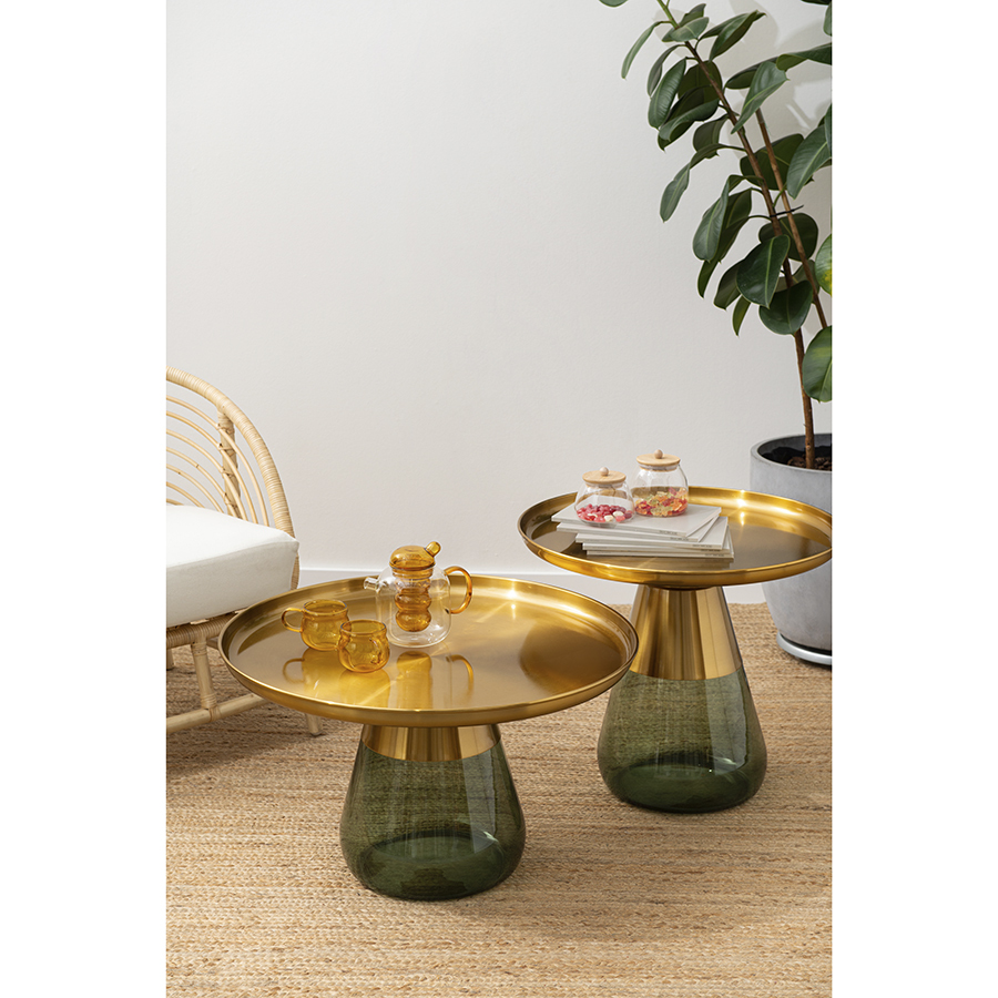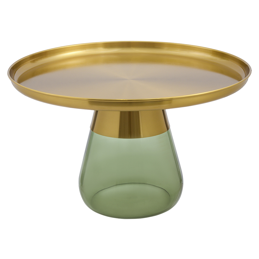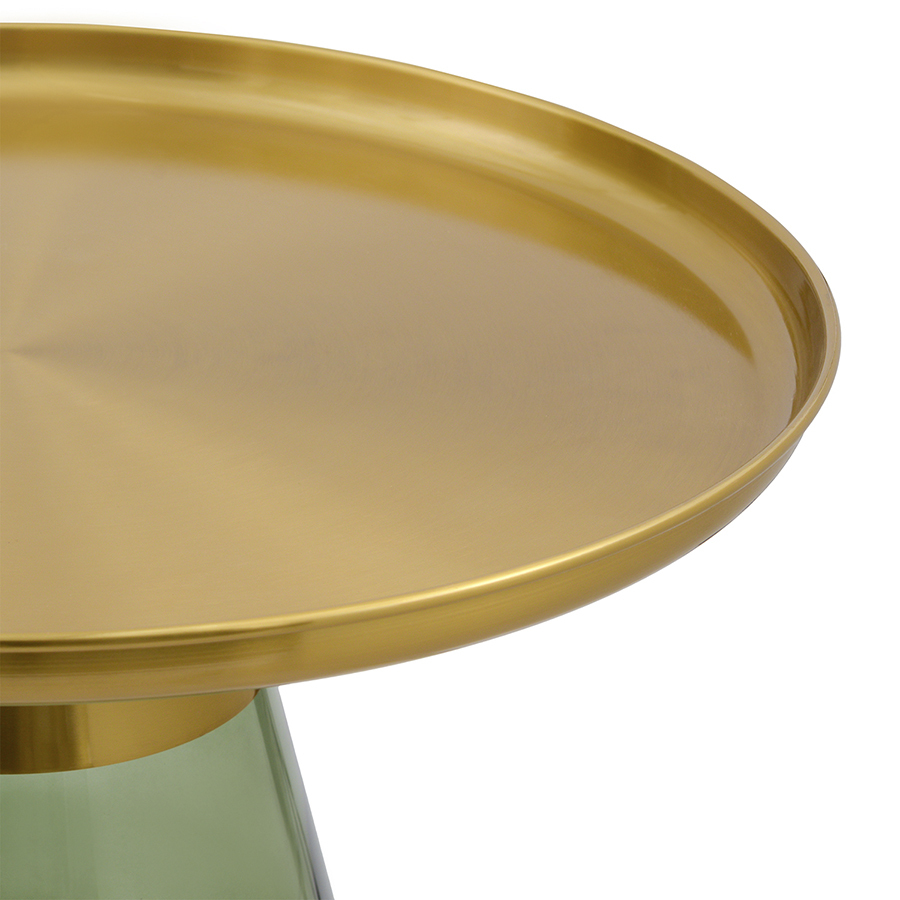 Материал: столешница – сталь, основание – закаленное стекло. Максимальная нагрузка - 10 кг. Диаметр: 70,5 см. Высота: 43 см. Цвет: латунь/зеленый.