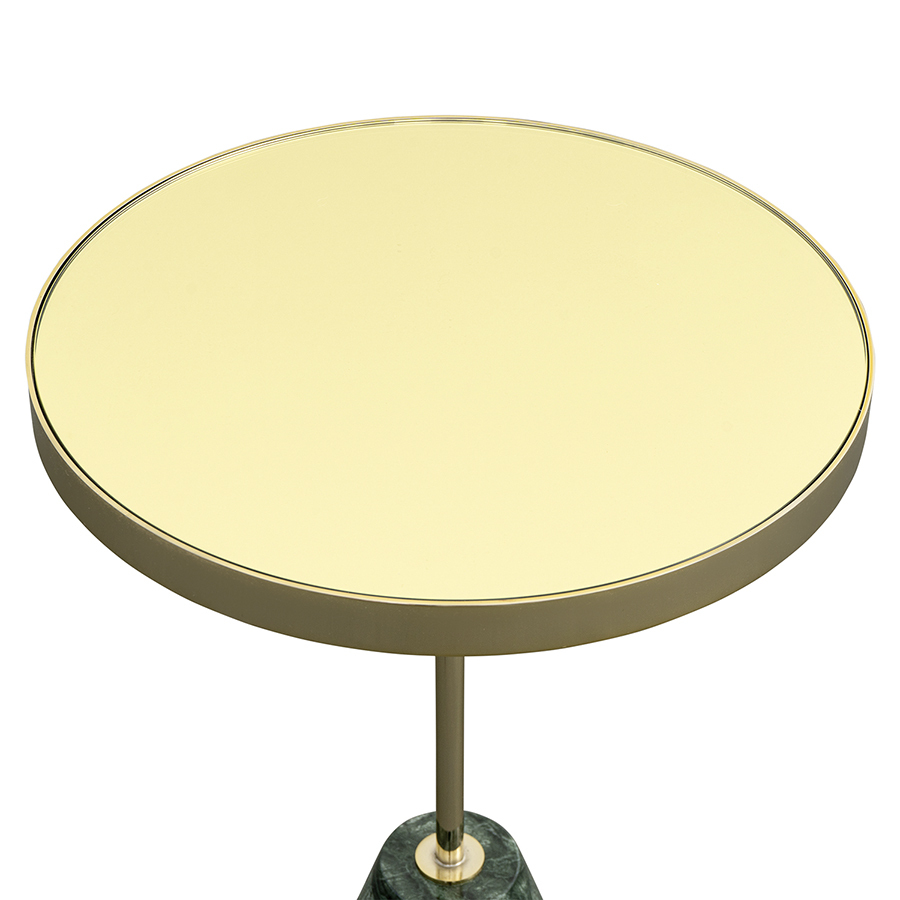 Материалы: столешница – зеркало золотистого оттенка, каркас – сталь, основание – мрамор. Размеры: 40,8х40,8х50,3 см. Цвет: золотистый/зеленый.