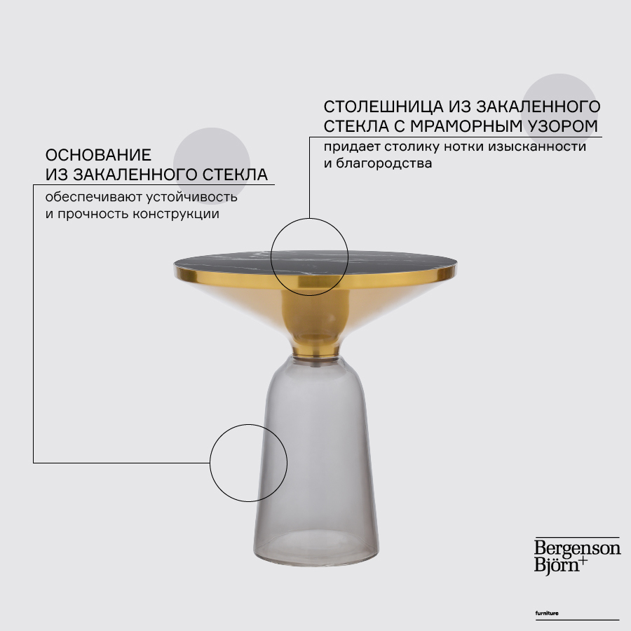Материалы: столешница – закаленное стекло с мраморным узором, основание – закаленное стекло, хромированная сталь. Максимальная нагрузка - 10 кг. Диаметр: 50 см. Высота: 52,5 см. Цвет: мрамор/черный.