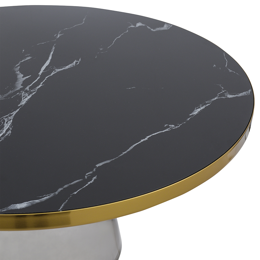 Материалы: столешница – закаленное стекло с мраморным узором, основание – закаленное стекло, хромированная сталь. Максимальная нагрузка - 10 кг. Диаметр: 75 см. Высота: 36 см. Цвет: мрамор/серый.