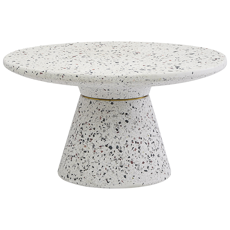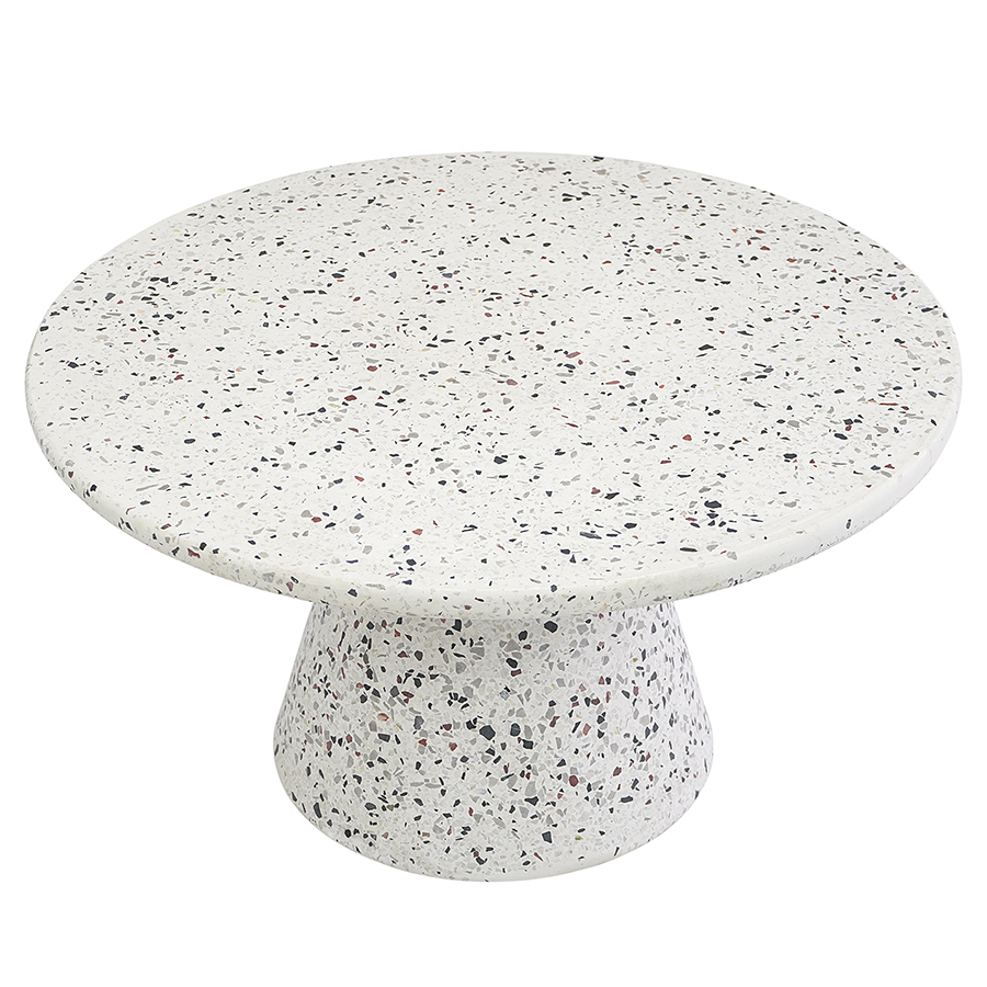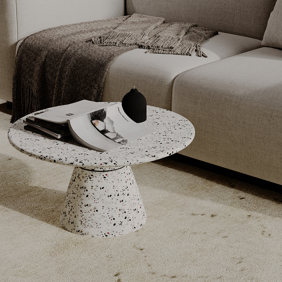 Столешница и основание столика выполнены из материала терраццо, характеризующегося высокой прочностью и устойчивостью к износу. В его состав входят мелкие кусочки натурального камня, скрепленные цементным раствором с добавлением пластификаторов. Поверхность терраццо гладкая, приятная на ощупь, прекрасно смотрится и не требует сложного ухода. Столешница диаметром 60 см позволяет размещать все необходимое – от чашек кофе до любимых книг и декора. При этом модель имеет компактные размеры, что способствует экономии полезного пространства.