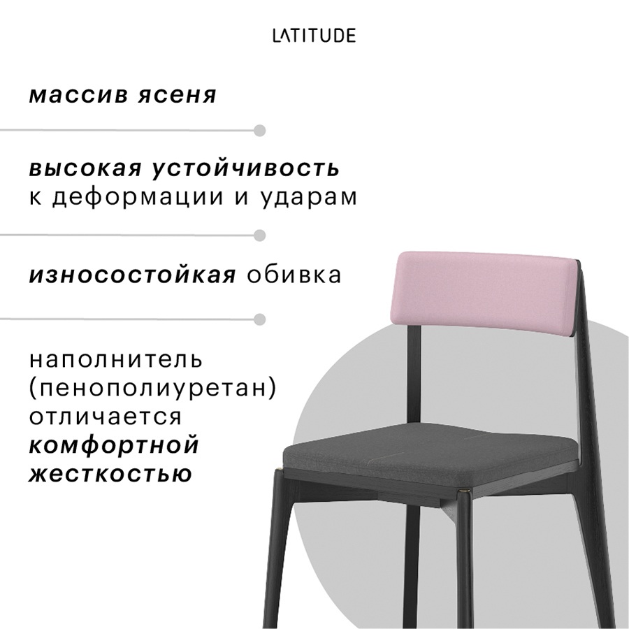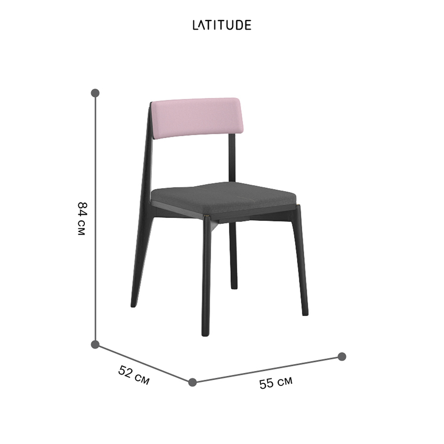 Материалы: массив ясеня, фанера, 100% полиуретан, 100% полиэстер. Размеры: 52х55х84 см. Высота сиденья: 48 см. Ширина сиденья: 45 см. Глубина сиденья: 44 см. Высота спинки: 37 см. Ширина спинки: 40 см. Максимальная нагрузка: 136 кг. Цвет основания: черный. Цвет обивки: темно-серый/розовый.