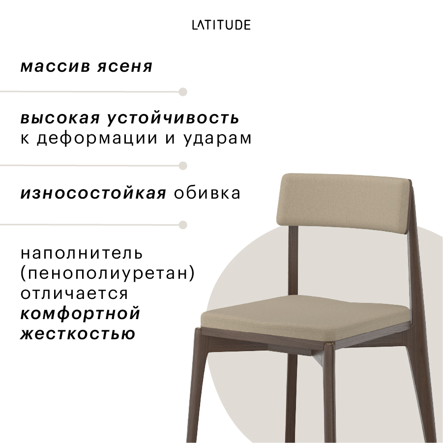 Материалы: массив ясеня, фанера, 100% полиуретан, 100% полиэстер. Размеры: 52х55х84 см. Высота сиденья: 48 см. Ширина сиденья: 45 см. Глубина сиденья: 44 см. Высота спинки: 37 см. Ширина спинки: 40 см. Максимальная нагрузка: 136 кг. Цвет основания: орех. Цвет обивки: бежевый.