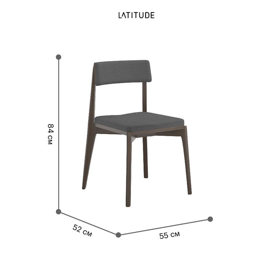 Материалы: массив ясеня, фанера, 100% полиуретан, 100% полиэстер. Размеры: 52х55х84 см. Высота сиденья: 48 см. Ширина сиденья: 45 см. Глубина сиденья: 44 см. Высота спинки: 37 см. Ширина спинки: 40 см. Максимальная нагрузка: 136 кг. Цвет основания: орех. Цвет обивки: темно-серый.
