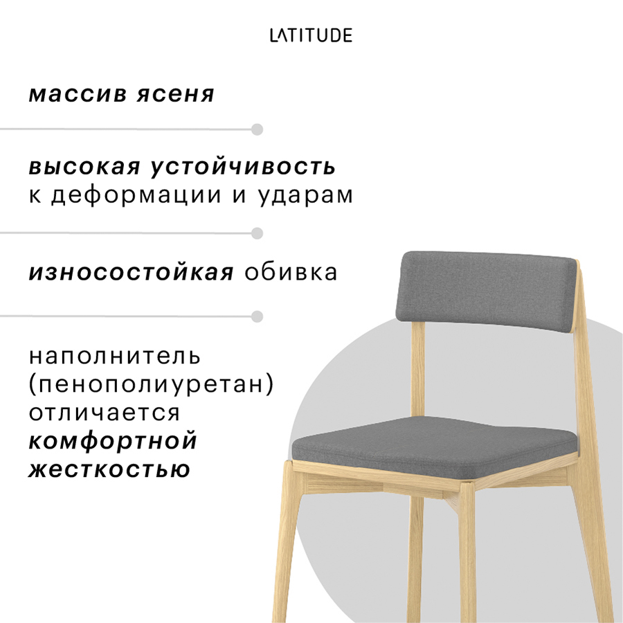 Материалы: массив ясеня, фанера, 100% полиуретан, 100% полиэстер. Размеры: 52х55х84 см. Высота сиденья: 48 см. Ширина сиденья: 45 см. Глубина сиденья: 44 см. Высота спинки: 37 см. Ширина спинки: 40 см. Максимальная нагрузка: 136 кг. Цвет основания: ясень. Цвет обивки: серый.