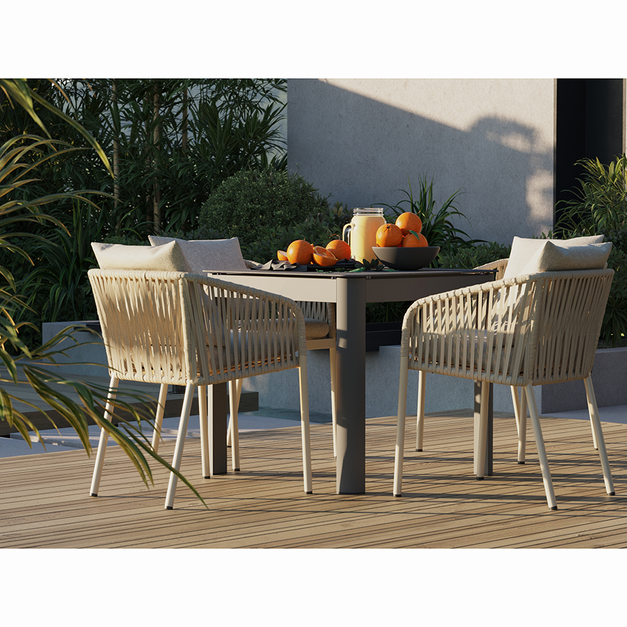 Материал: алюминий, полиэстер, пенополиуретан. Размеры: 57х58х77 см. Высота сиденья: 48 см. Цвет: серо-бежевый.