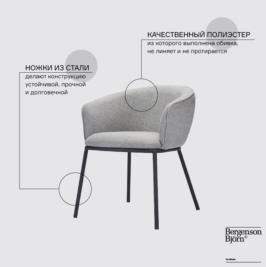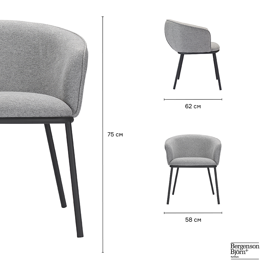 Материалы: 87% полиэстер, 10% вискоза, 3% нейлон, фанера, железо, поролон. Размеры: 62х58х75 см. Высота сиденья: 50 см. Ширина сиденья: 43 см. Глубина сиденья: 42 см. Высота спинки: 33 см. Ширина спинки: 37 см. Цвет: серый.