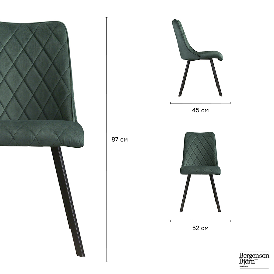 Материалы: 100% полиэстер, фанера, поролон, железо. Размеры: 45х52х87 см. Высота сиденья: 49 см. Ширина сиденья: 41 см. Глубина сиденья: 42 см. Высота спинки: 43 см. Ширина спинки: 36 см. Цвет: темно-зеленый.