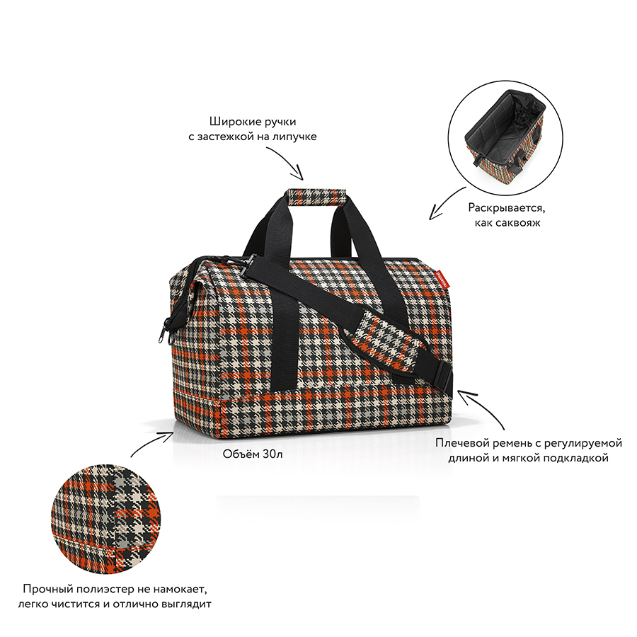 Allrounder L – практичная и вместительная сумка для спорта и путешествий. Форма аксессуара напоминает старинные врачебные саквояжи. Особенности: - объёмное основное отделение на молнии - встроенные металлические скобы фиксируют сумку в открытом положении - 6 внутренних карманов для организации вещей - широкие ручки с застежкой на липучке - плечевой ремень с регулируемой длиной и мягкой подкладкой - объем – 30 литров