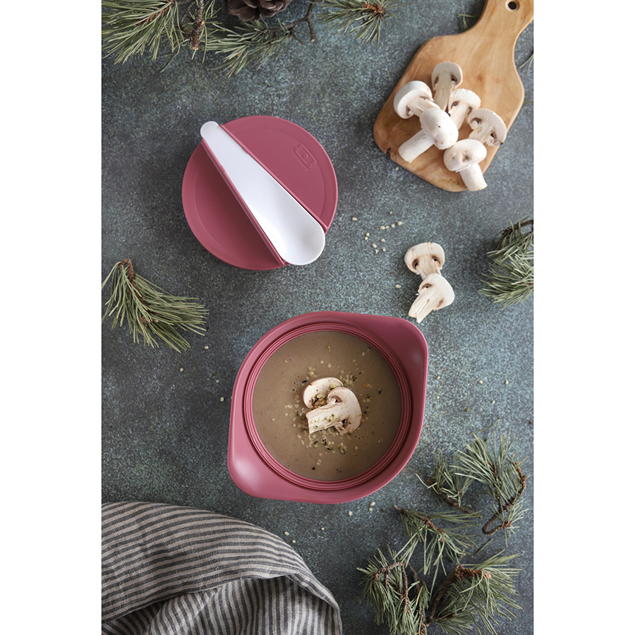 Вакуумная крышка плотно прилегает к основе, не дает даже капле просочиться наружу. А специальный дизайн супницы и двойные стенки позволяют без проблем держать ее в руках, даже если внутри очень горячая еда. В комплекте идет ложка, которая аккуратно и надежно закрепляется на крышке супницы.