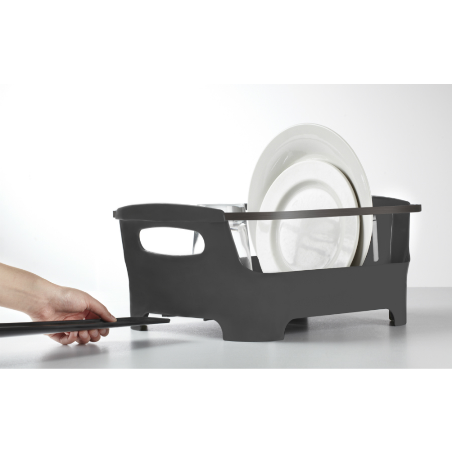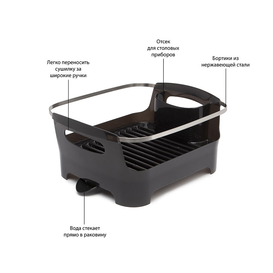 Сушилка для посуды Basin – стильный и удобный аксессуар для современной кухни. Изделие оснащено бортиком из нержавеющей стали, который не только защищает посуду от падения, но и делает конструкцию более привлекательной. Сушилка изготовлена из высококачественного пластика без содержания вредного бисфенола. Вода с вымытой посуды через желобки для тарелок стекает в специальное отделение, где собирается и выводится в раковину через носик сбоку аксессуара.
