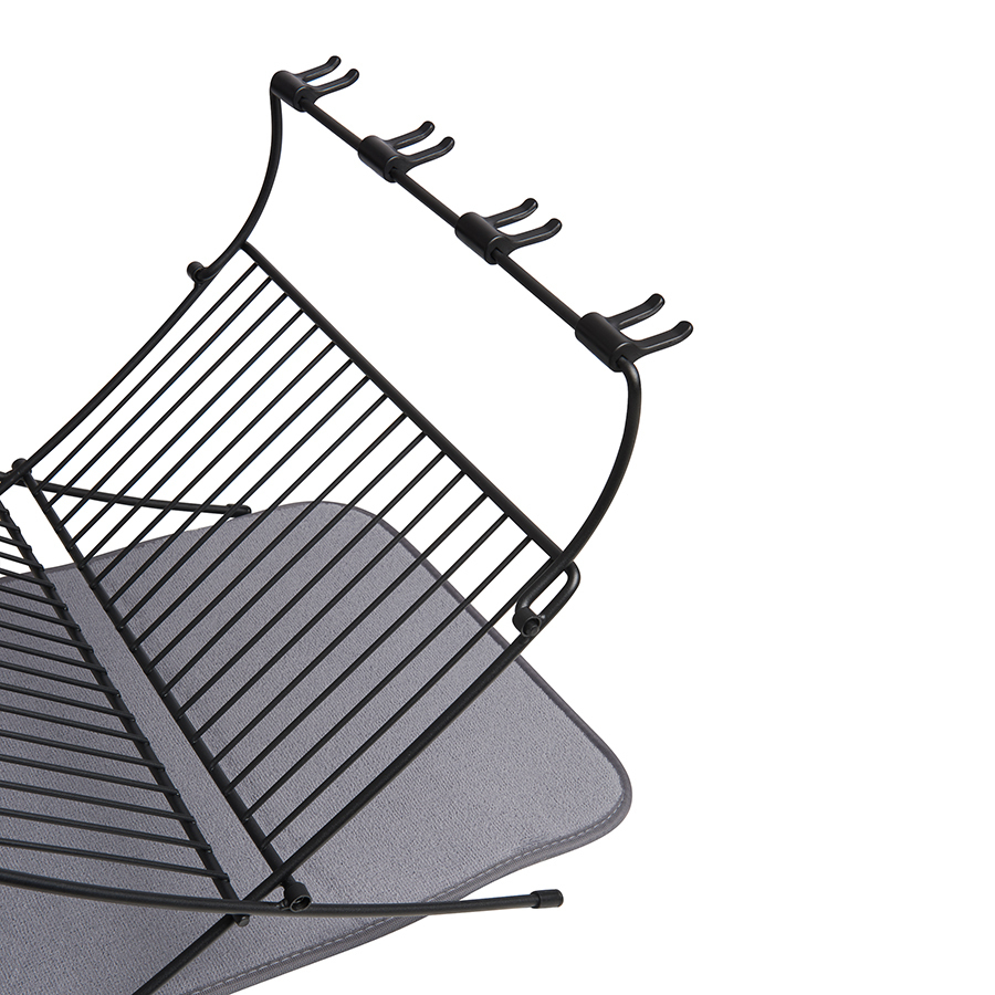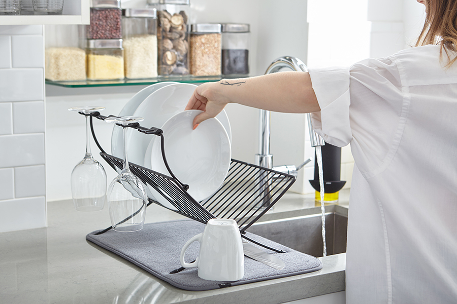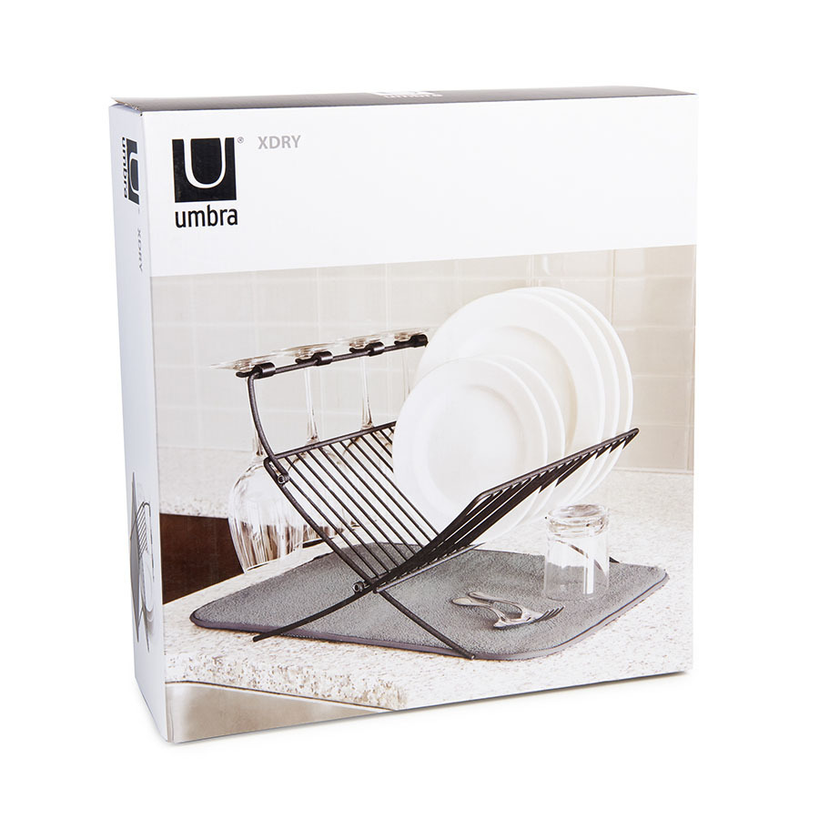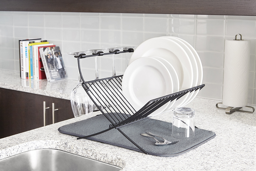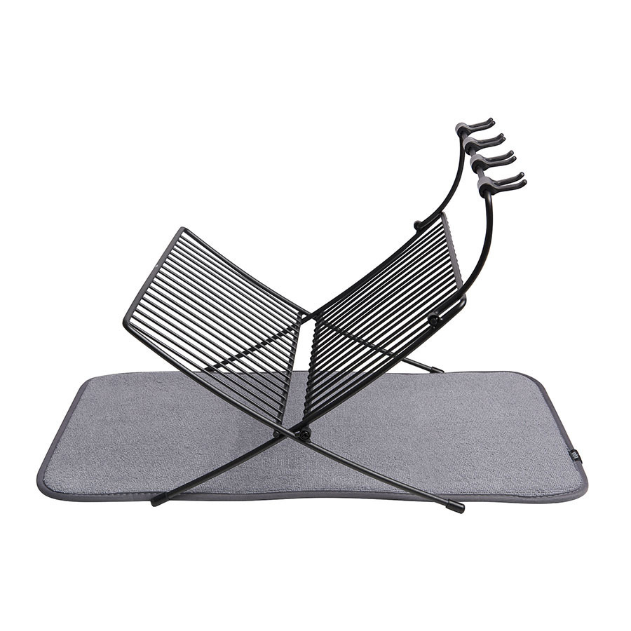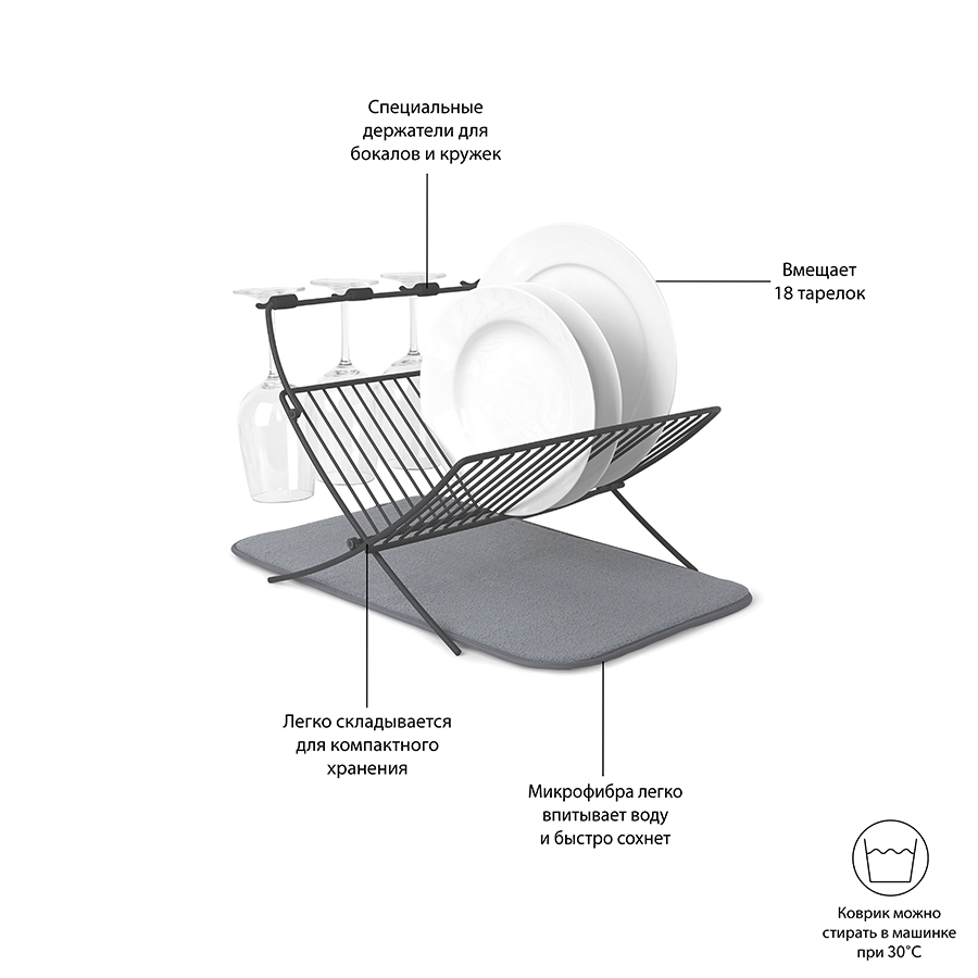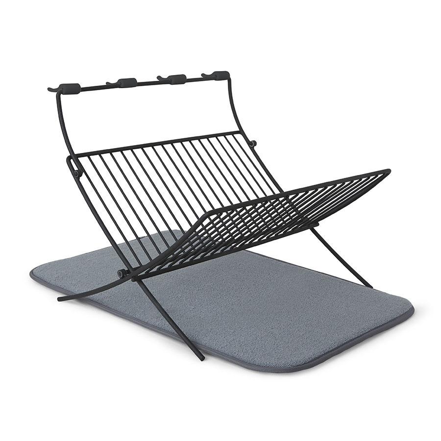 Функциональный предмет 2-в-1, в котором объединены коврик из микрофибры и подставка для сушки посуды. На коврике удобно сушить чашки, стаканы и глубокие миски, а на сушкилке тарелки, блюдца и винные бокалы. Сушилка рассчитана на 17 тарелок или блюд и 4 бокала. Специальный высокий кронштейн позволяет сушить бокалы в подвешенном состоянии, предотвращая образование конденсата. Сушилка компактно складывается для хранения. Дизайнер David Green