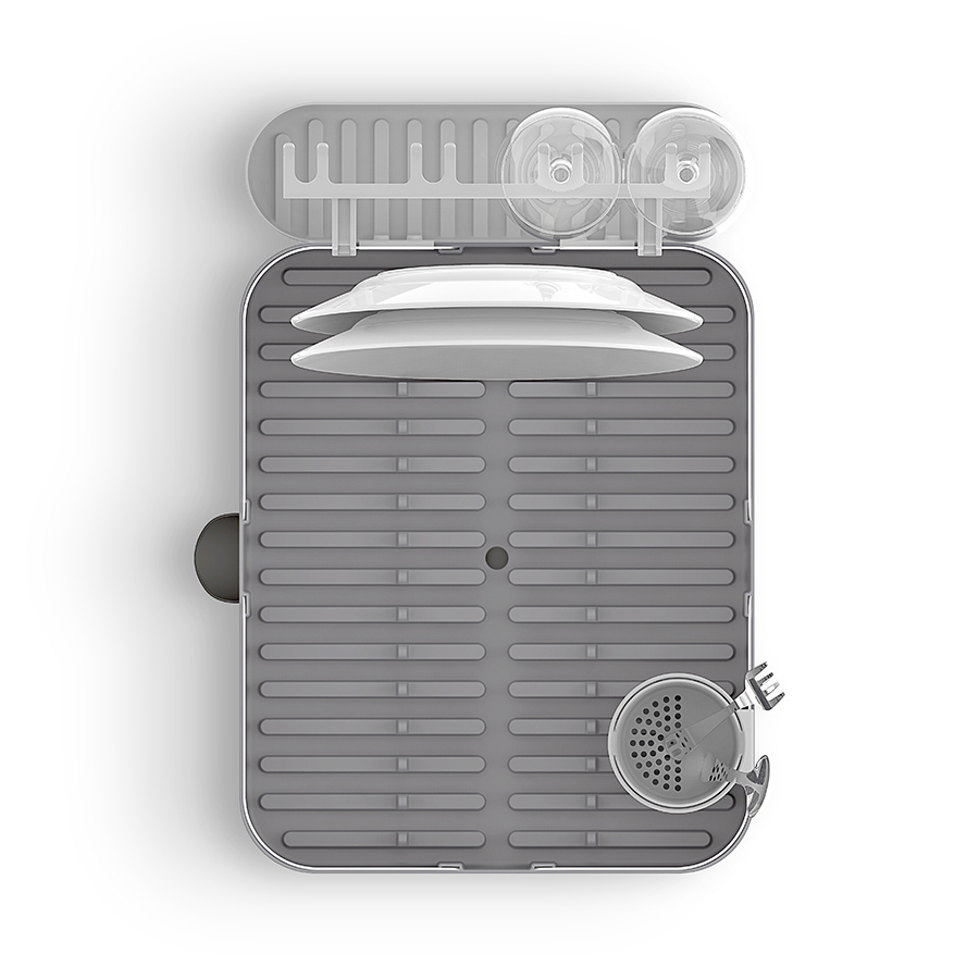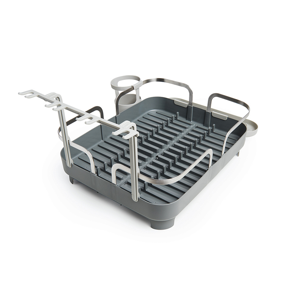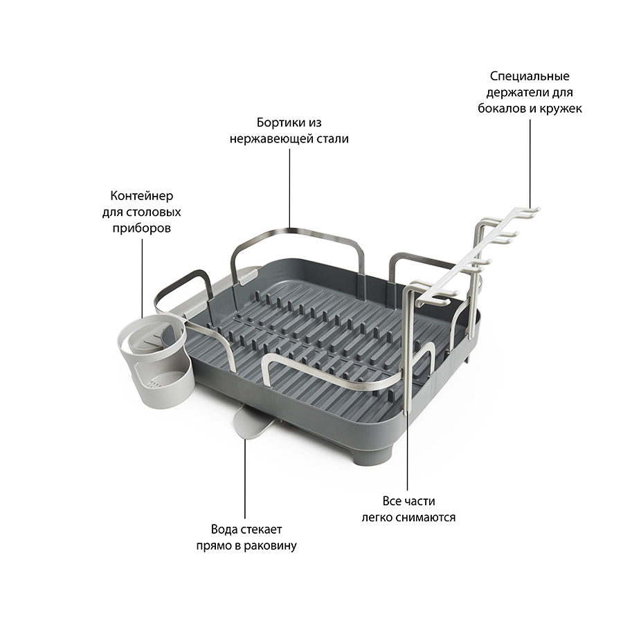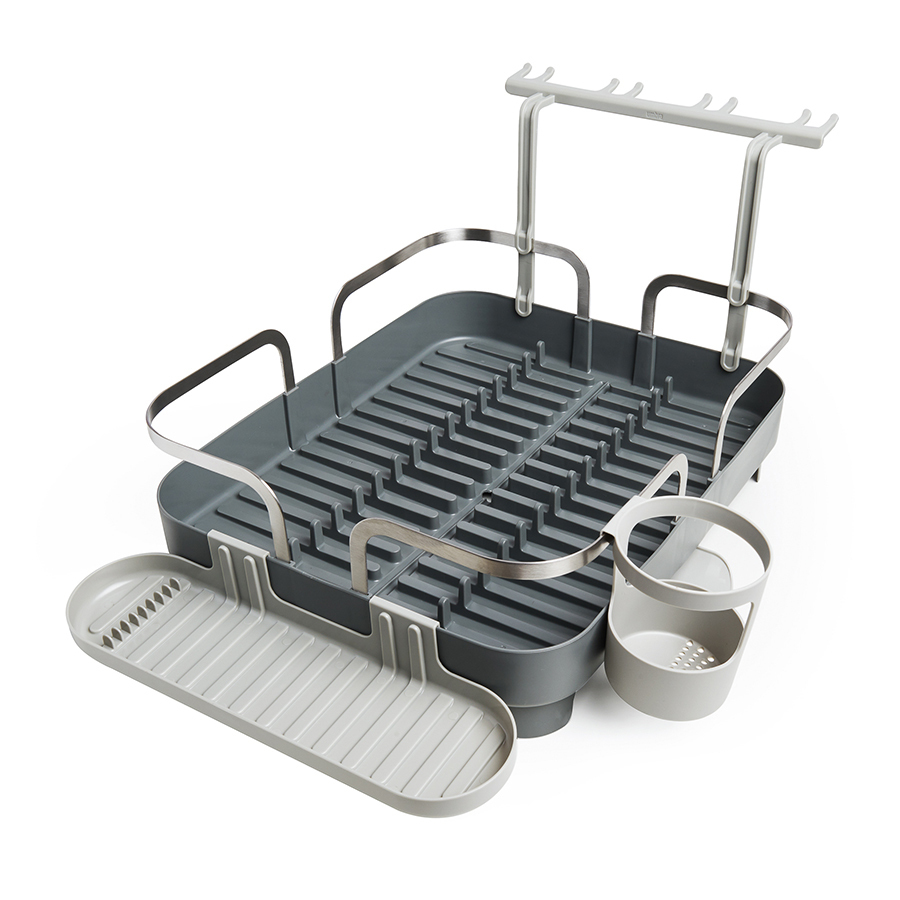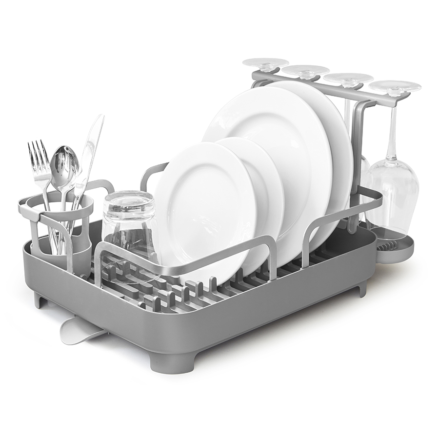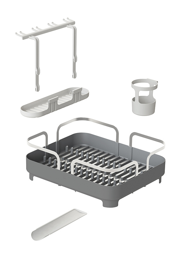 Целый сушильный комплекс на вашей кухне! Многофункциональная сушилка для посуды, состоящая из стальной рамы и пластикового поддона. Решётка поддона рассчитана на сушку 15 тарелок. Кроме того, предусмотрено несколько съемных частей, которые можно конфигурировать так, как удобно вам: стакан для сушки столовых приборов, специальная рама для сушки винных бокалов и узкий боковой отсек c делениями для сушки ножей. Все эти части можно навешивать как внутри, так и снаружи сушилки. Снизу боковой части сушилки предусмотрен слив, который не даст воде застаиваться. Дизайнер David Green