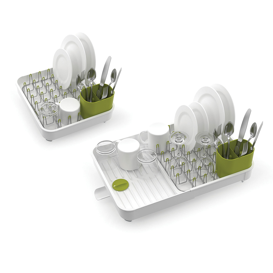При необходимости изделие раздвигается. Излишки воды стекают через встроенный слив. Вода перекрывается поворотом слива, благодаря чему сушилку можно переносить с места на место, не проливая жидкость. Металлические стойки с мягкими зубцами бережно удерживают тарелки, защищая их от царапин. Съемный контейнер для столовых приборов оснащён нескользящими ножками, которые обеспечивают надежную устойчивость. Стальная решетка снимается для удобной очистки.