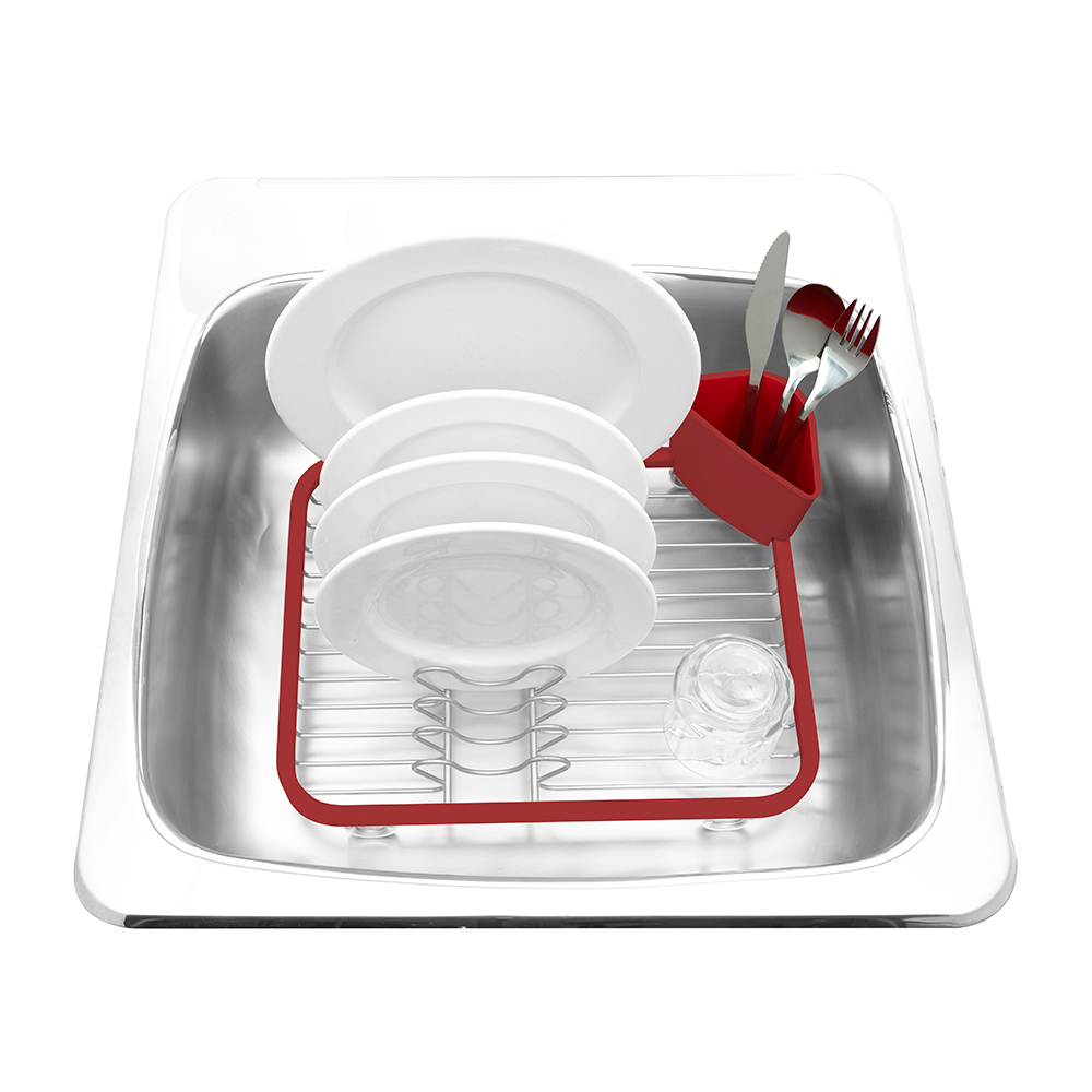 Предусмотрены отсеки для тарелок и чашек. Съемный пластиковый контейнер удобен для сушки столовых приборов. Благодаря специальным ножкам вода стекает в раковину, не застаиваясь под посудой. Пластиковые насадки на ножках оберегают раковину от царапин. Металлическая решетка и пластиковое обрамление легко очищаются от загрязнений.