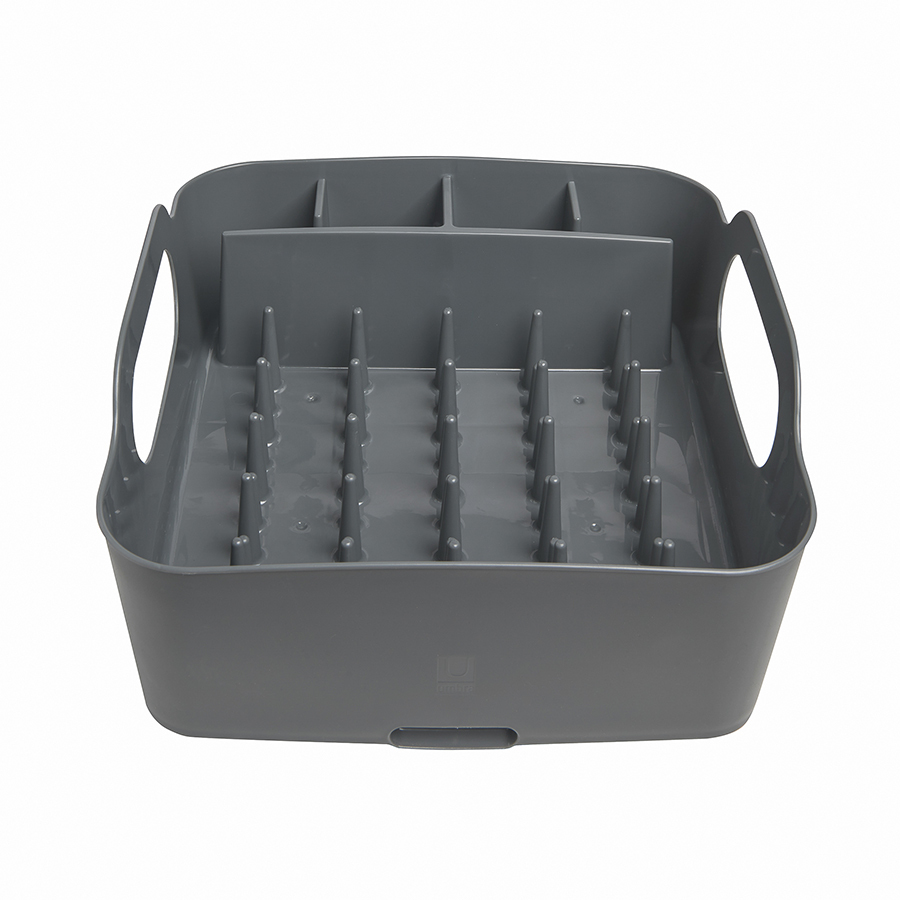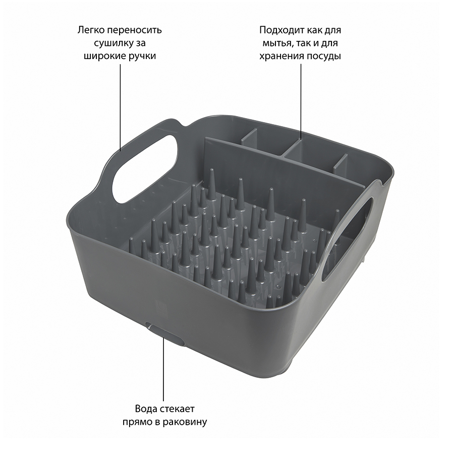 Мобильная сушилка для посуды состоит из пяти отделений: широкого — для сушки тарелок, чашек и сотейников и четыре маленьких для столовых приборов и аксессуаров. Выступы разной высоты на дне сушилки позволяют аккуратно расставить посуду. Благодаря ножкам и отверстию для слива, вода не будет застаиваться, что предотвратит появление неприятного запаха.
