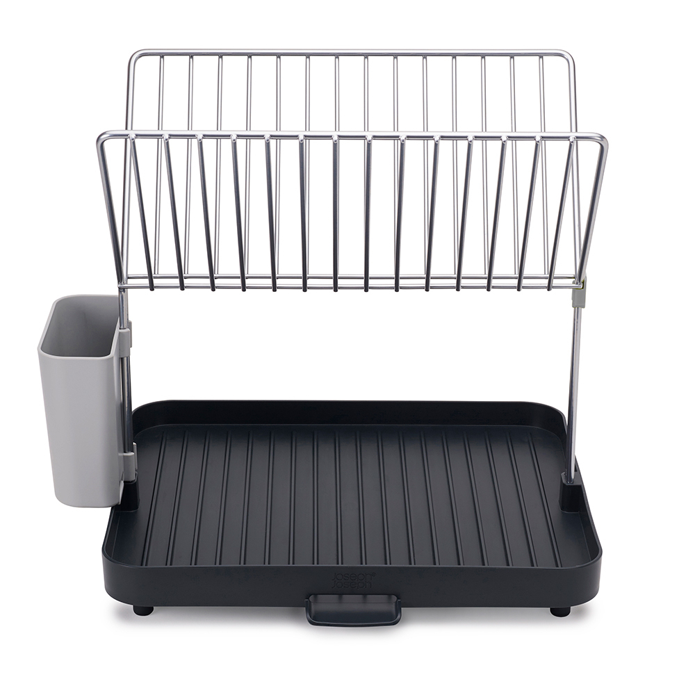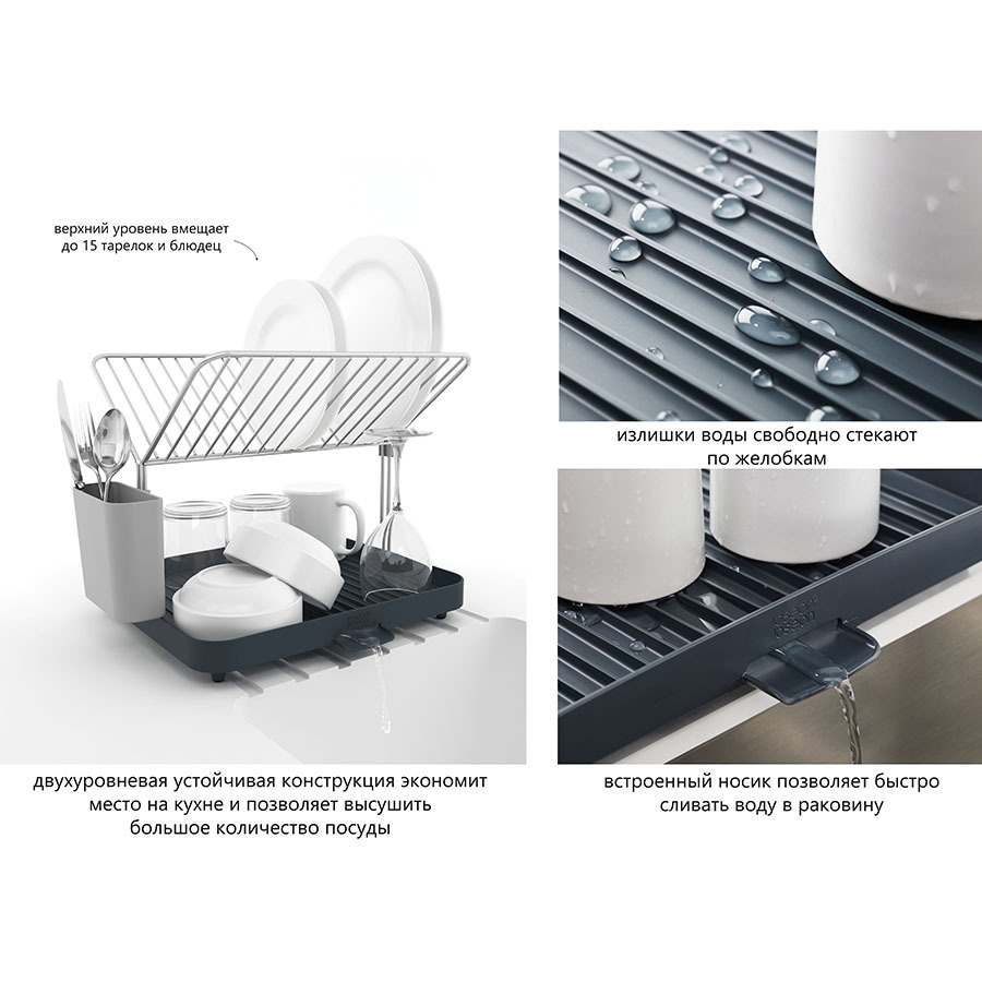 Эргономичная сушилка для посуды, позволяющая сэкономить место на кухне. Двухуровневая конструкция состоит из устойчивого основания для кастрюль, сковородок и чашек и из верхней решетки, вмещающей до 15 тарелок и блюдец. Объемное отделение со сливом предоставляет возможность тщательно осушить до 4 комплектов посуды — и все это на минимальном участке пространства. Вода свободно стекает по желобкам, расположенным у основания под наклоном, а встроенный носик позволяет быстро сливать жидкость прямо в раковину. Нескользящие ножки обеспечивают устойчивость. Конструкция разбирается на части для легкой очистки. Инструкции по сборке идут в комплекте.
