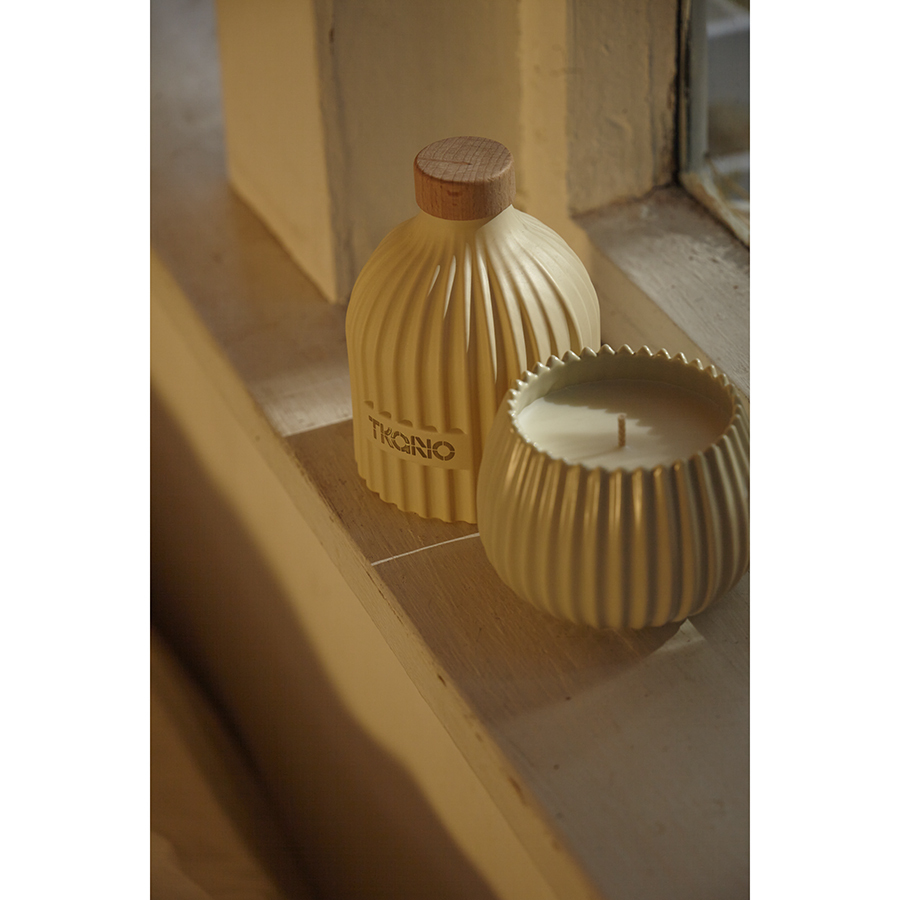 Соевый воск, кокосовый воск, ароматическая композиция, хлопковый фитиль. Для создания ароматической композиции использовались отдушки из Англии.