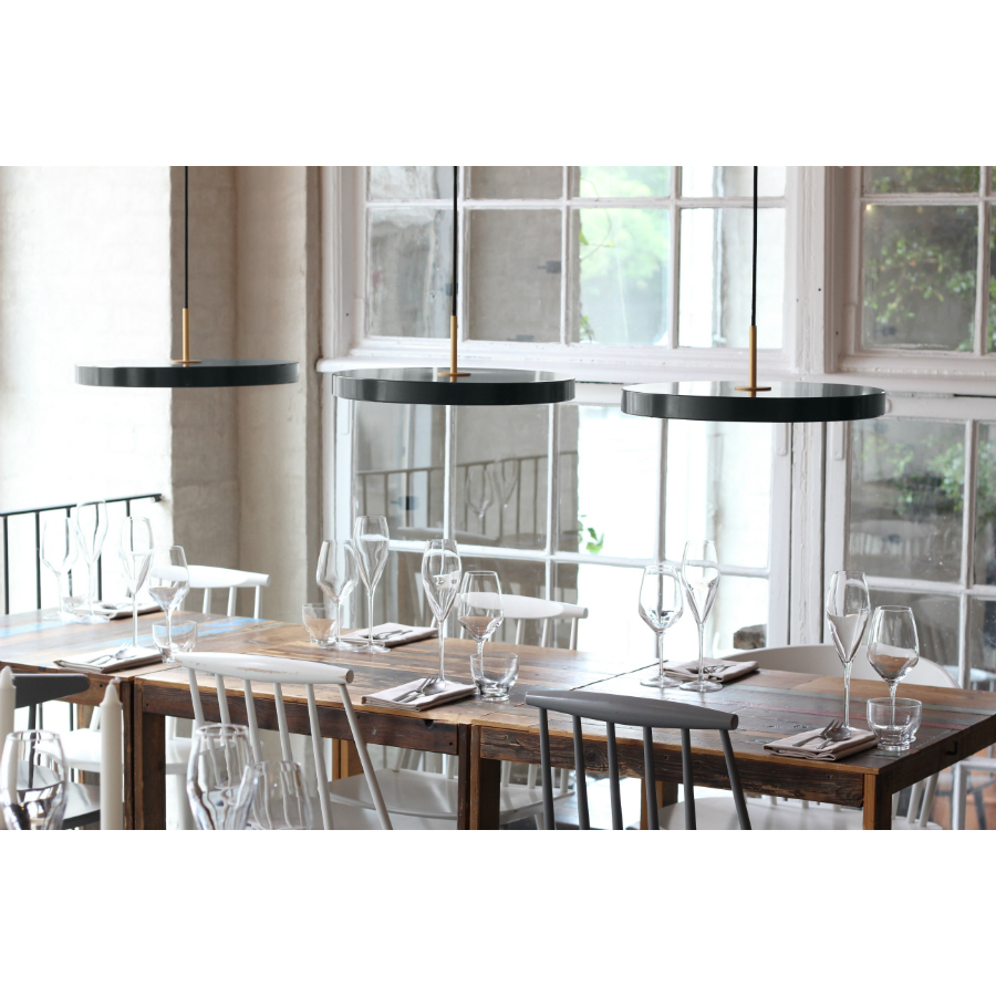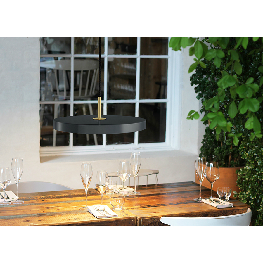 Дизайн этого светильника идеально подходит для размещения над кофейным столиком или в обеденной зоне. Утонченная форма не мешает обзору и не скрывает лица, сидящих напротив друг друга. В комплект входит: источник света, 2,7 м провод для подключения, металлический канопи и плафон. Есть возможность выбора цвета фиксатора: стальной, черный, латунный. Размеры: ?43 х 14,3 см