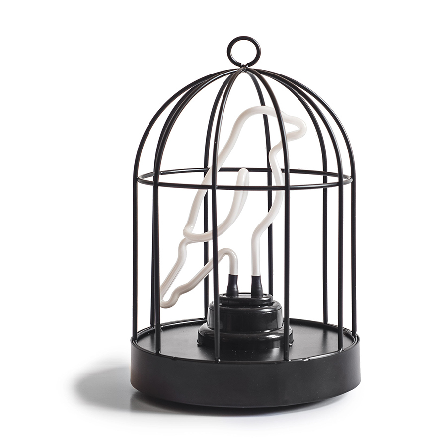 Стильный неоновый светильник идеально дополнит интерьер гостиной, веранды и придомового участка. Он выполнен в виде небольшой птички в черной металлической клетке, которую можно расположить на столе или подвесить к потолку при помощи крючка. В темное время суток такая лампа будет ярко освещать пространство, а днем служить оригинальным декоративным элементом. Лампа работает от 4-х батарей ААА или от USB-кабеля (длиной 2 м). Благодаря этому она полностью автономна и подходит для использования на открытой территории. За включение и выключение отвечает небольшой переключатель на корпусе. Дизайн Nick Lerwill Размеры: 16х25.5х16 см Вес: 0.48 кг