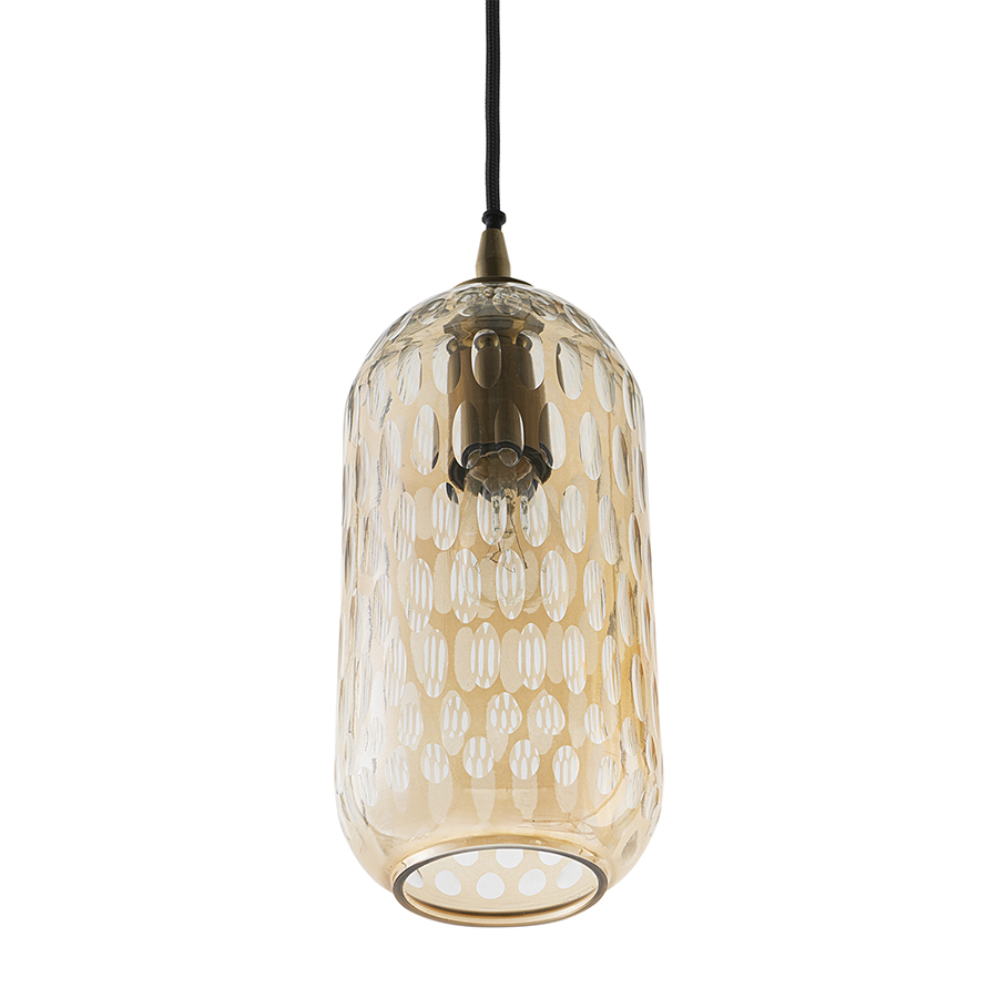 Материалы: стекло, железо. Размеры: 14х14х32 см. Цвет: янтарно-золотой. Длина провода: 1,5 м. Тип цоколя: Е27. Максимальная мощность ламп: 40 Вт. Степень пылевлагозащиты: IP20. Диаметр монтажной пластины: 11 см. Площадь освещения: 2,7 кв.м. Лампы в комплекте: нет.