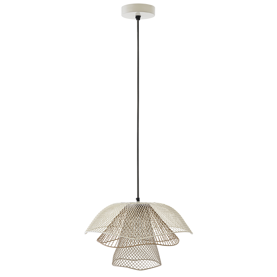 Материал: железо. Размеры светильника: 48х48х30 см. Размеры основания: 10х10х2 см. Цвет: белый/бежевый/золотой. Тип цоколя: Е27. Степень пылевлагозащиты: IP20. Максимальная мощность ламп: 25 Вт. Напряжение: 220-240 В. Длина подвеса: 50,8-127 см. Площадь освещения: 1,7 кв.м. Лампы в комплекте: нет.