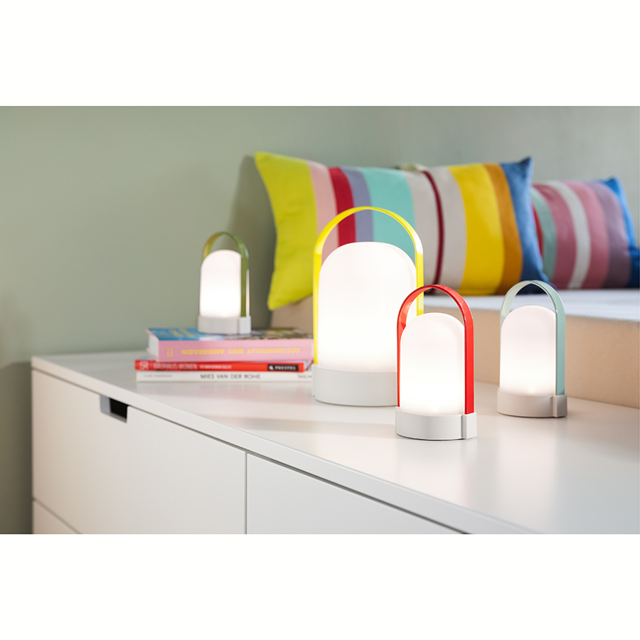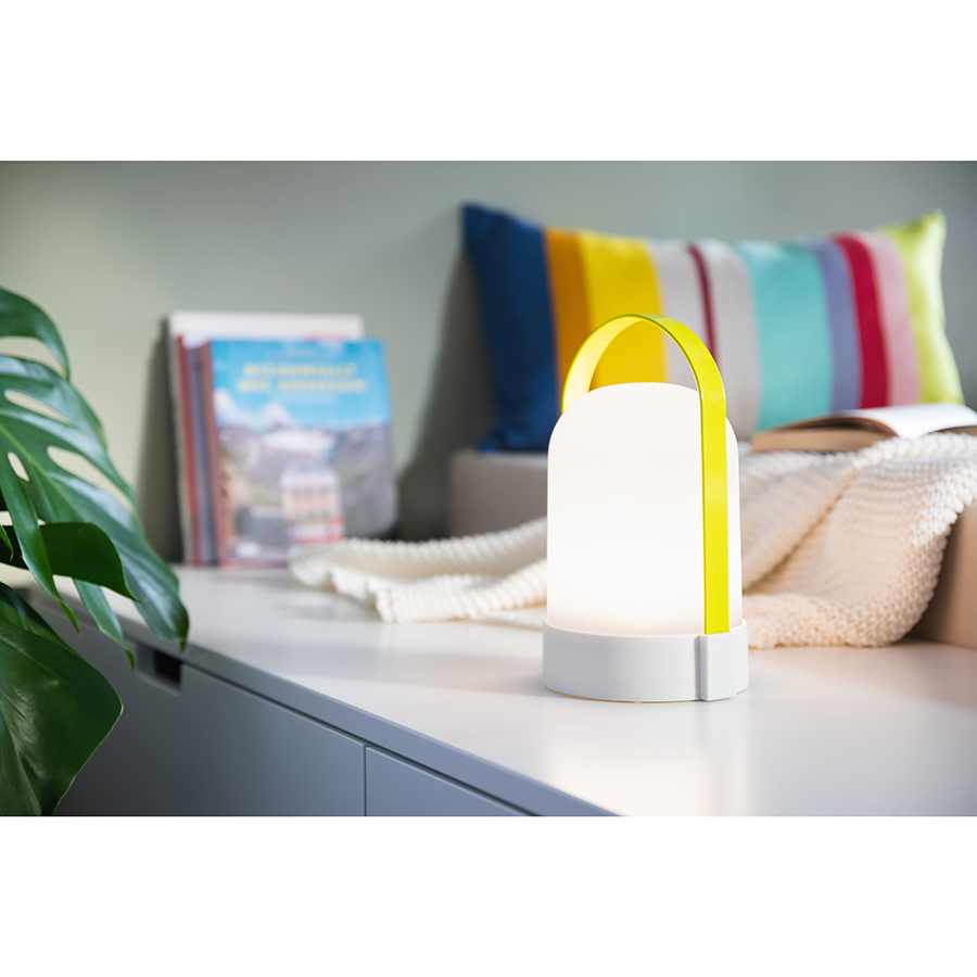 Удобная ручка позволяет переносить светильник с места на место или подвешивать его на ветви деревьев в саду. Заряжайте светильник с помощью длинного USB-кабеля (2 м), покрытого приятным на ощупь текстилем. Изделие полностью заряжается за 3-4 часа и работает около 20 часов. Яркость света – 30 лм.