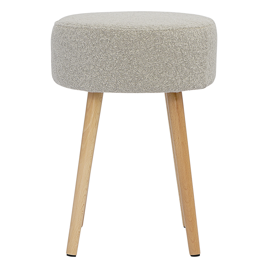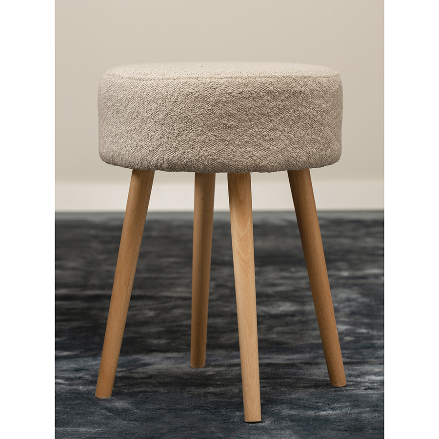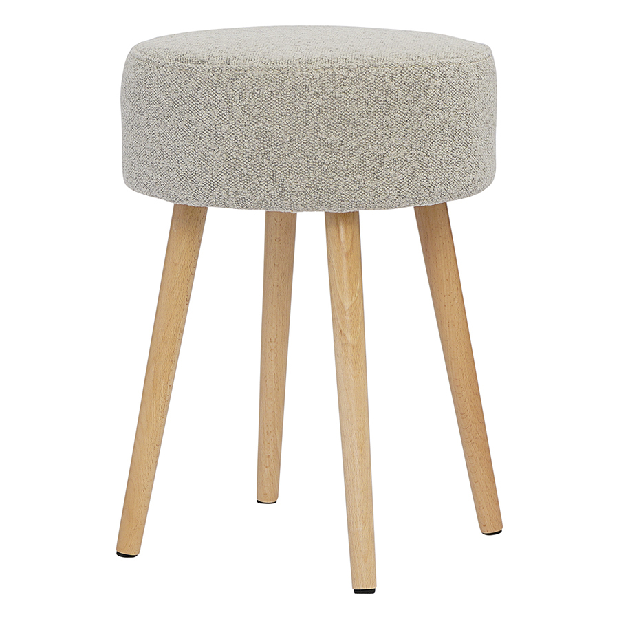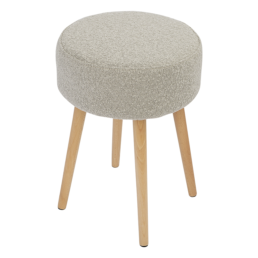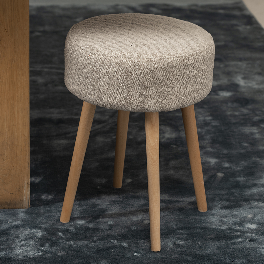 Мягкое сиденье с обивкой из буклированной ткани и деревянные ножки делают мебель уютной и оригинальной. Такое сочетание материалов легко комбинируется практически с любой современной отделкой и декором. Ткань приятная на ощупь, при этом прочная и долговечная. Табурет также может использоваться как дополнительное место для сидения в комнате или в качестве подставки для ног во время отдыха на кресле или диване.