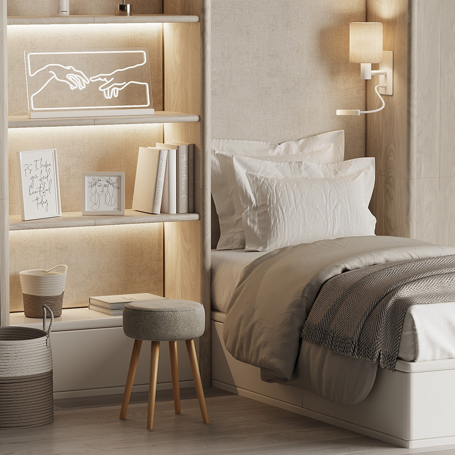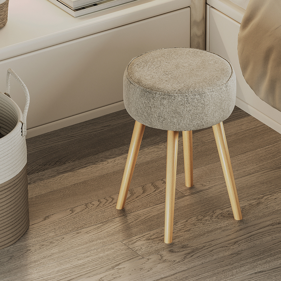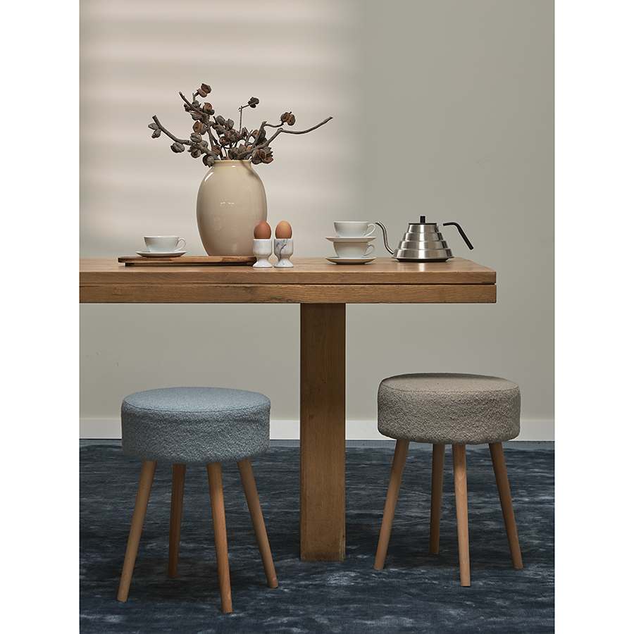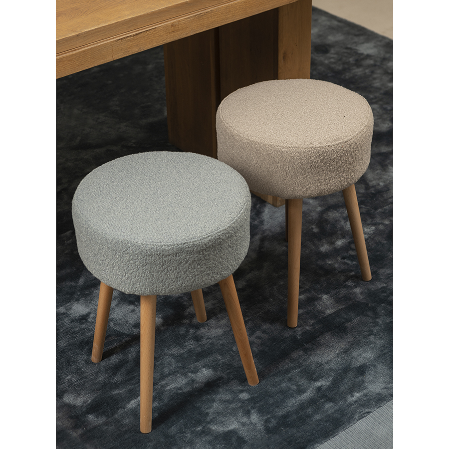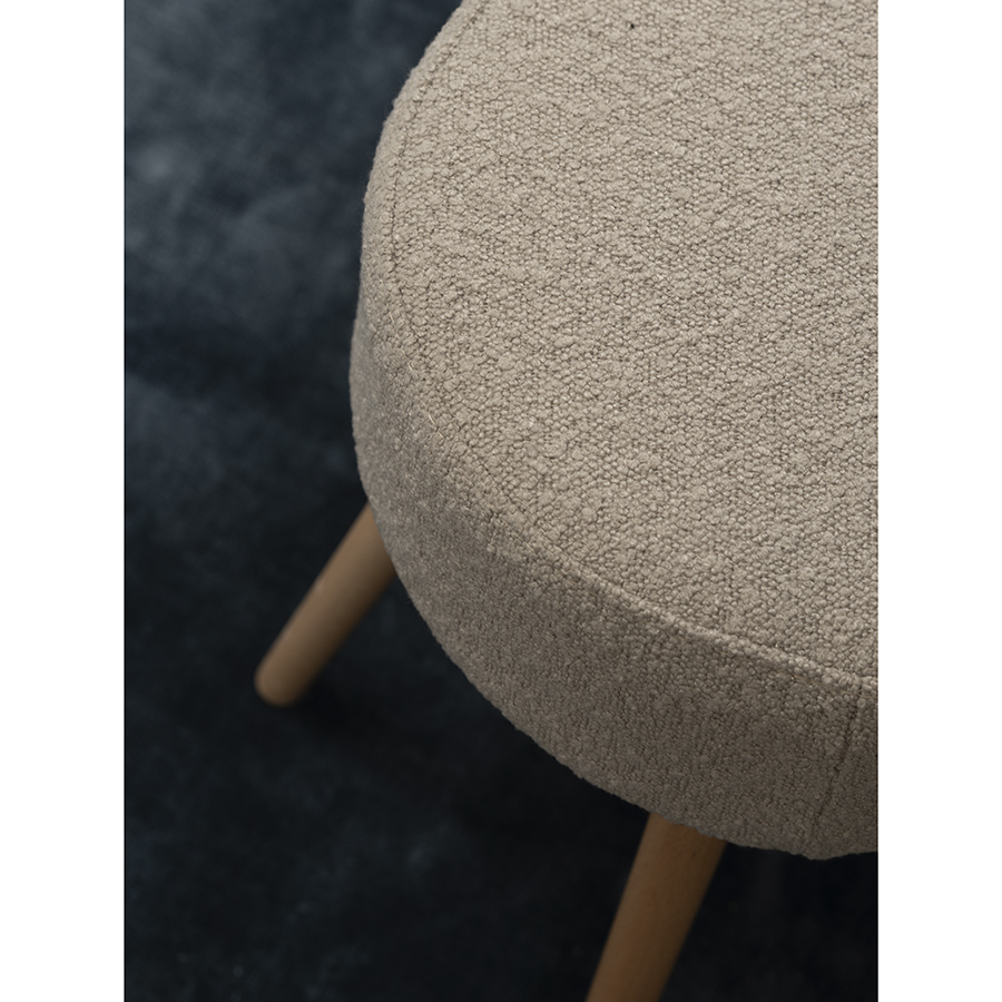 Мягкое сиденье с обивкой из буклированной ткани и деревянные ножки делают мебель уютной и оригинальной. Такое сочетание материалов легко комбинируется практически с любой современной отделкой и декором. Ткань приятная на ощупь, при этом прочная и долговечная. Табурет также может использоваться как дополнительное место для сидения в комнате или в качестве подставки для ног во время отдыха на кресле или диване.