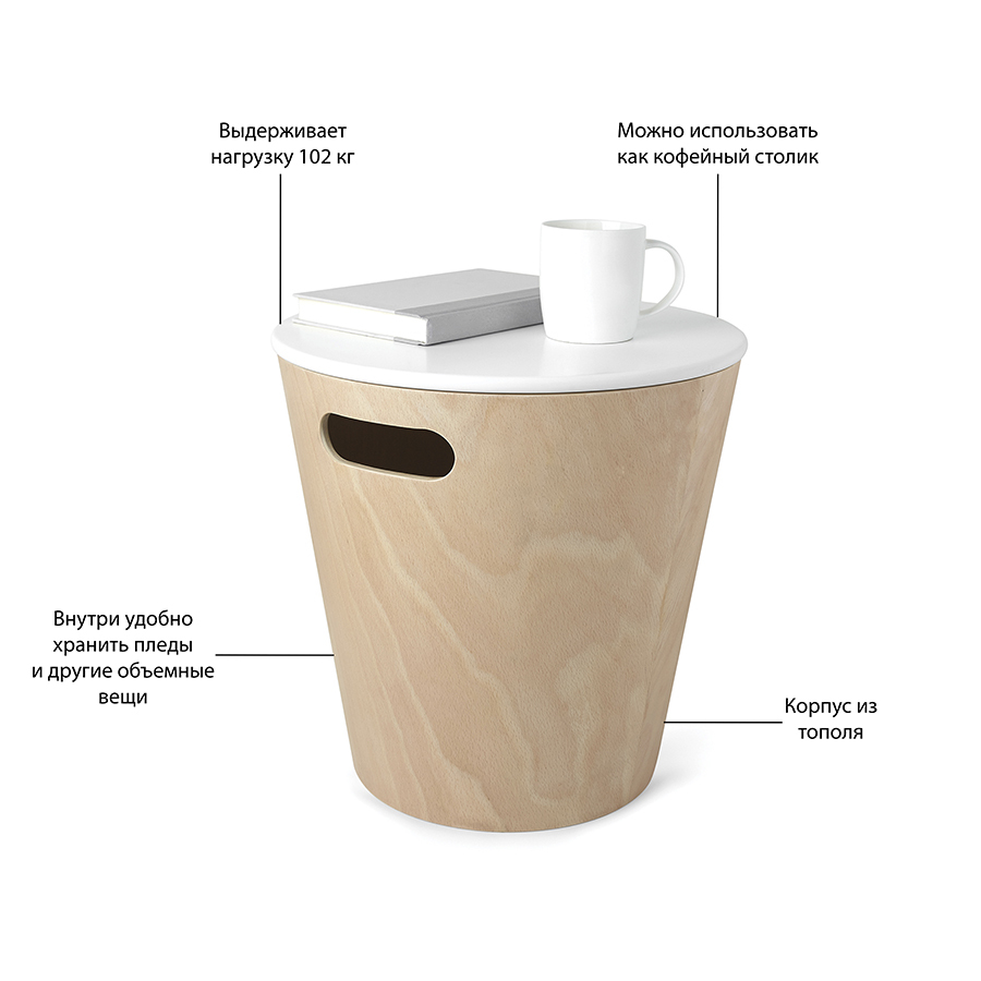 Woodrow может быть использован как приставной, кофейный столик или как табурет, а также для хранения под крышкой журналов, детских игрушек и других мелочей. Дизайнер: Wesley Chau.