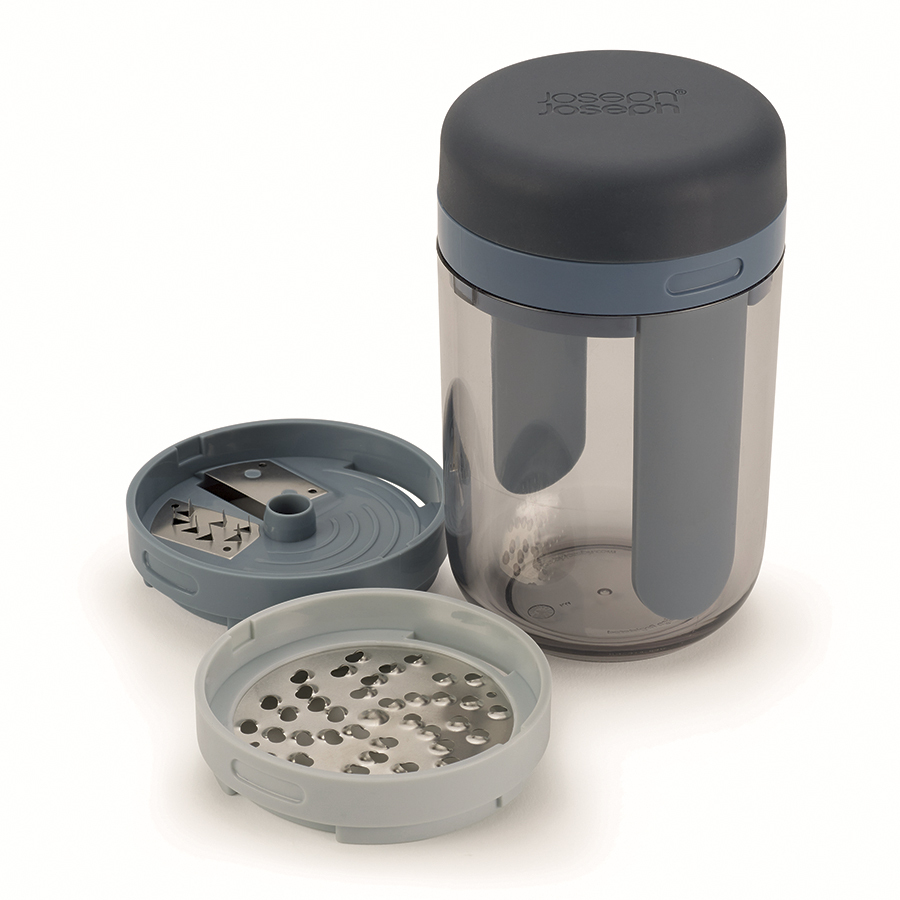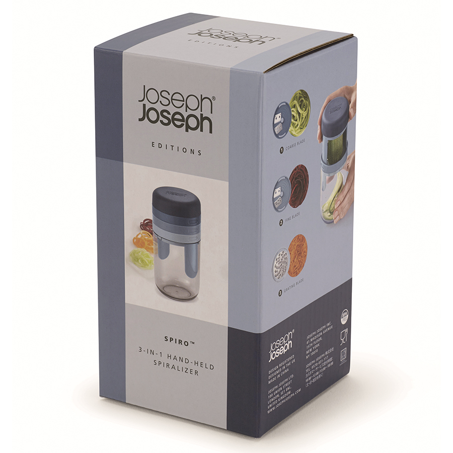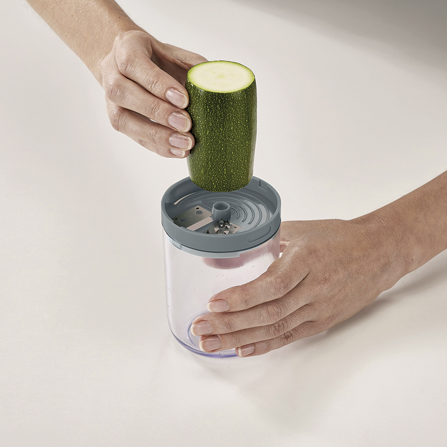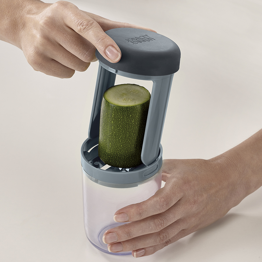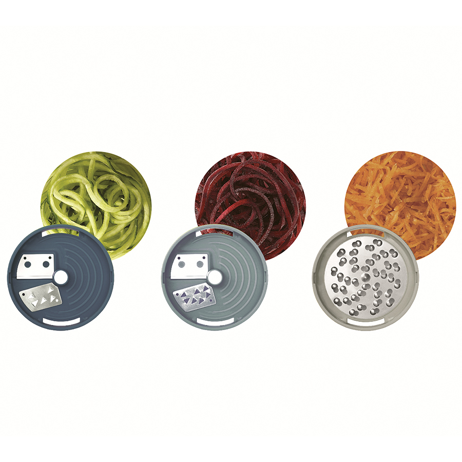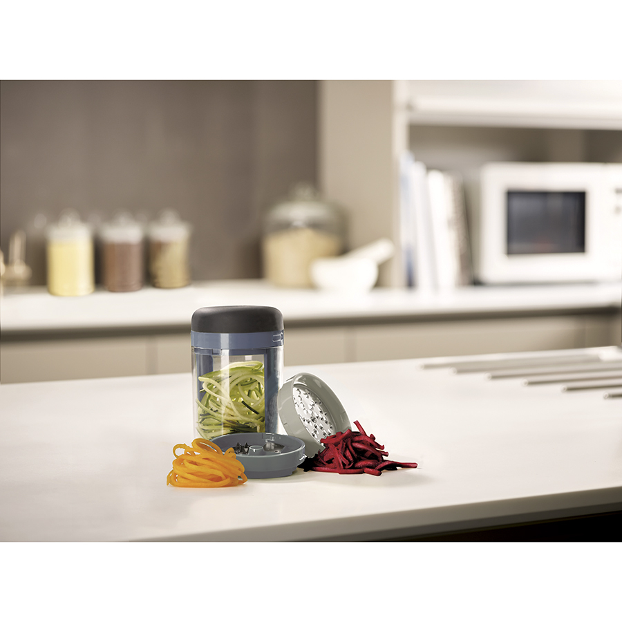 В комплект входит крупное и среднее лезвие, насадка для сыра и небольшой контейнер для сбора натертых овощей или фруктов. Легкая в использовании конструкция делает длинные ровные полосы при закручивании. Полученная овощная «лапша» подходит для украшения праздничных блюд или для приготовления различных салатов. Приятная на ощупь рукоятка не выскальзывает во время эксплуатации. Для лучших результатов используйте ровные куски приблизительно 8 х 4 см. После измельчения промокните продукты с высоким содержанием сока, например, кабачки и цуккини, чтобы они не подтекали. Для создания длинных спиралей помещайте продукты в центр диска. Все элементы соединяются в одном контейнере и занимают минимум места в ящике стола.
