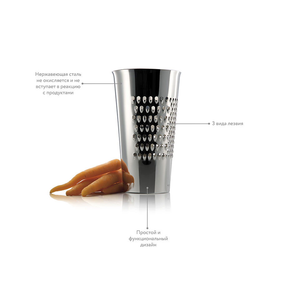 Натирайте овощи, сыр, шоколад и другие продукты в практичное ведерко из нержавеющей стали.