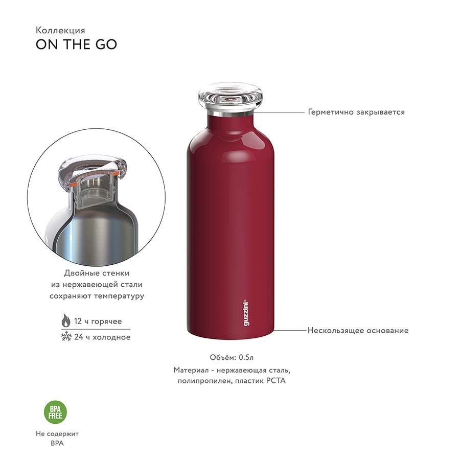 Термобутылка On the go подходит для холодных и горячих напитков: воды, фруктовых соков, чая, кофе и молока. Ее можно взять с собой в офис, в университет или на прогулку. Бутылка из нержавеющей стали с нескользящим основанием устойчива к царапинам и потертостям. Двойные стенки корпуса эффективно сохраняют температуру напитков: холодных до 24 часов и горячих до 12 часов. Крышка обеспечивает полную герметичность, предотвращая проливание напитков. Благодаря объему 500 мл и компактным размерам бутылка легко поместится в сумку или рюкзак.
