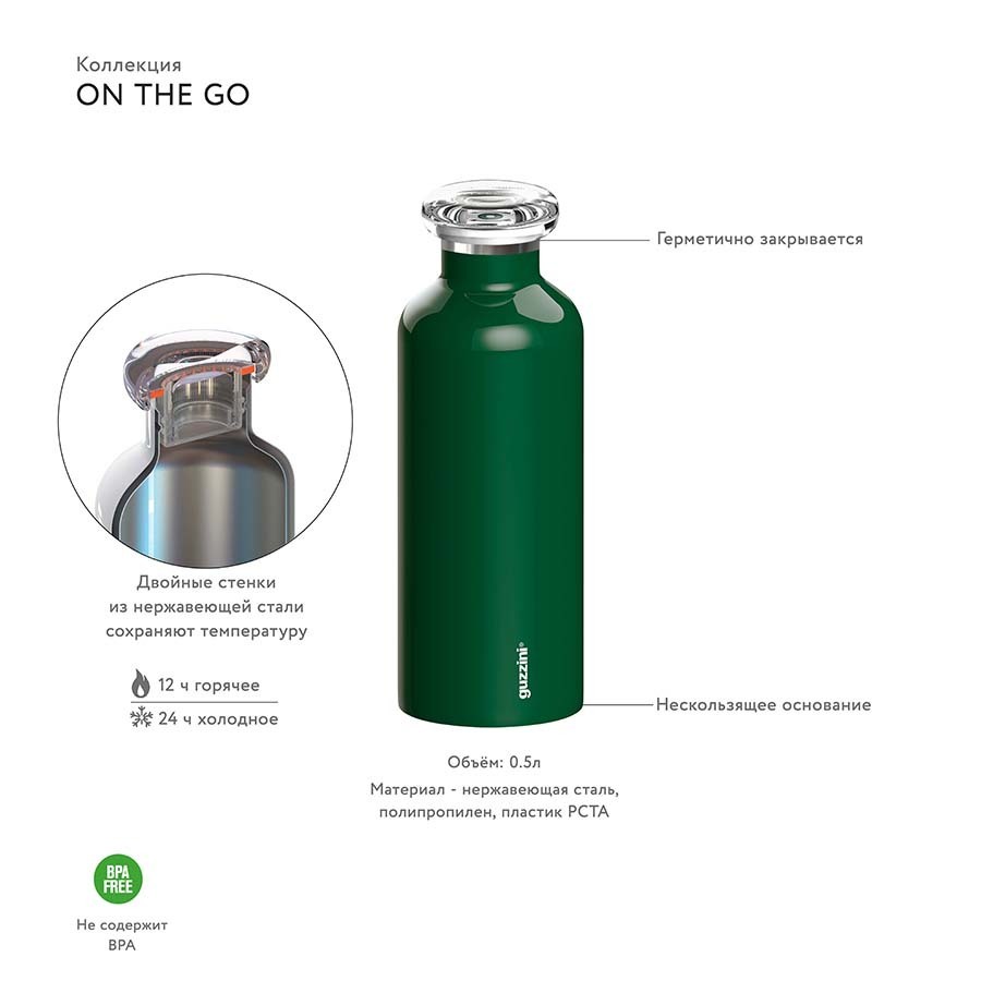 Термобутылка On the go подходит для холодных и горячих напитков: воды, фруктовых соков, чая, кофе и молока. Ее можно взять с собой в офис, в университет или на прогулку. Бутылка из нержавеющей стали с нескользящим основанием устойчива к царапинам и потертостям. Двойные стенки корпуса эффективно сохраняют температуру напитков: холодных до 24 часов и горячих до 12 часов. Крышка обеспечивает полную герметичность, предотвращая проливание напитков. Благодаря объему 500 мл и компактным размерам бутылка легко поместится в сумку или рюкзак.