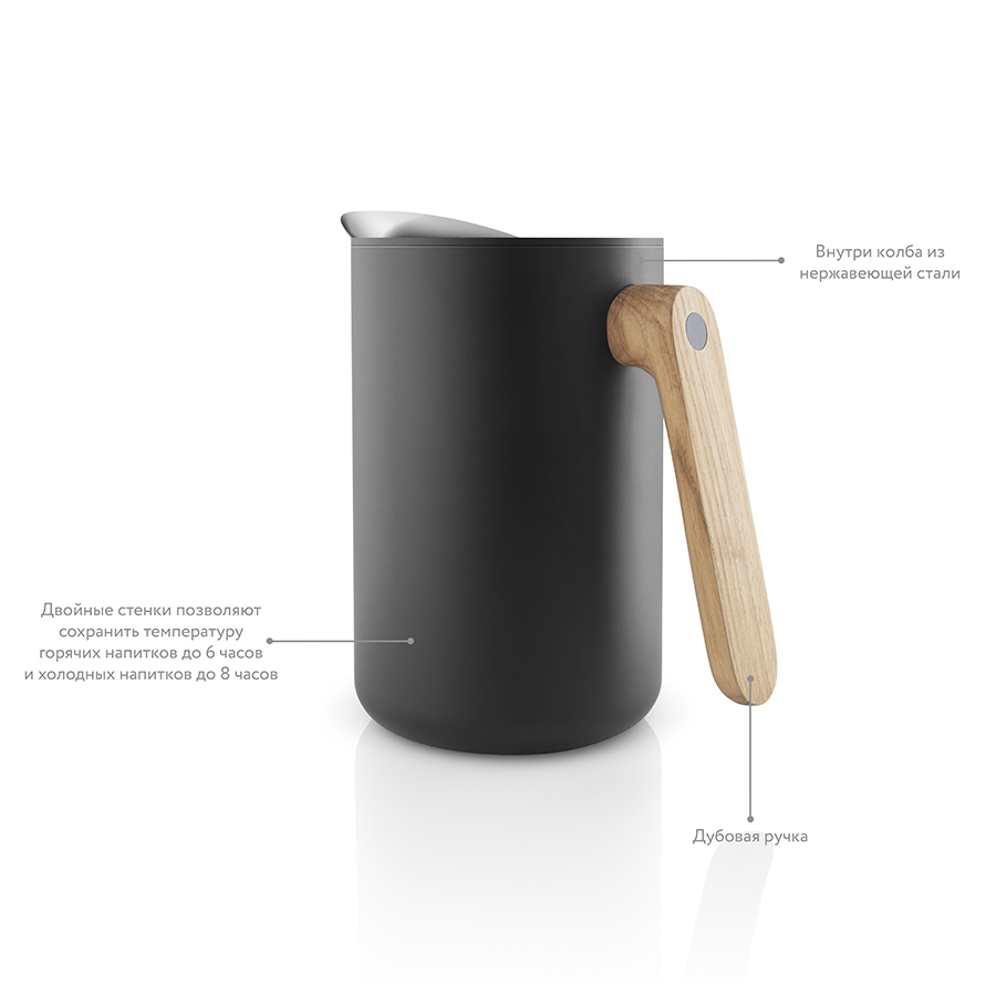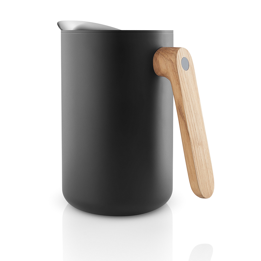 Минималистичный дизайн и высокая функциональность составляют суть скандинавского дизайна. Коллекция предметов сервировки Nordic kitchen воплотила все черты северной эстетики. Простой выверенный дизайн, чёрный цвет и натуральное дерево в рустикальном скандинавском стиле. Термокувшин с корпусом из чёрного матового пластика и ручкой из натурального дуба. Носик из нержавеющей стали специально разработан, чтобы жидкость не расплёскивалась при наливании. Внутри термокувшина - стальная колба. Крышка плотно закрывается, чтобы чай или кофе максимально долго сохраняли свою температуру. Объём 1 литр.